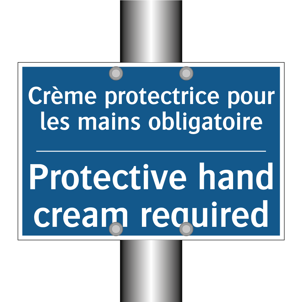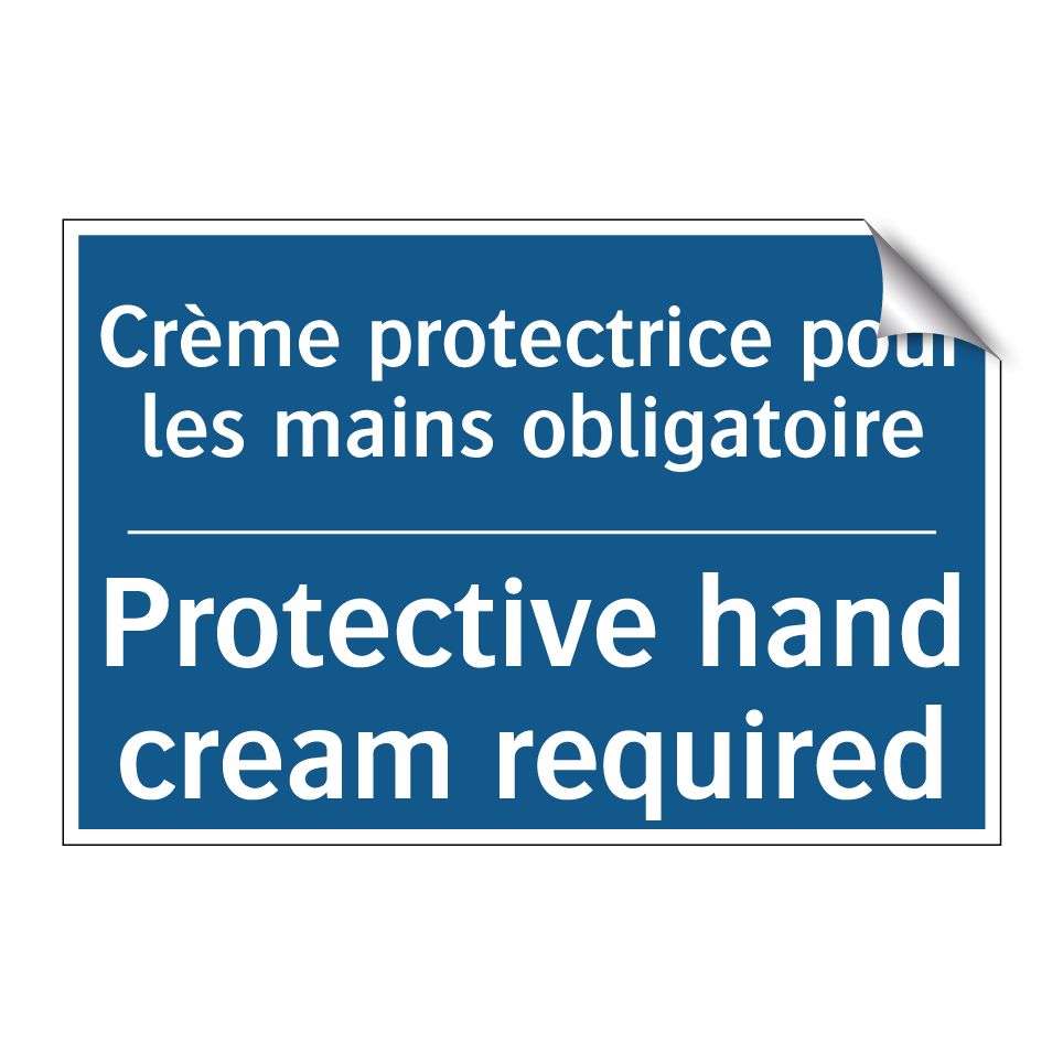 Panneau d'obligation bilingue avec texte en français : "Crème protectrice pour les mains obligatoire", et en anglais : "Protective hand cream required"