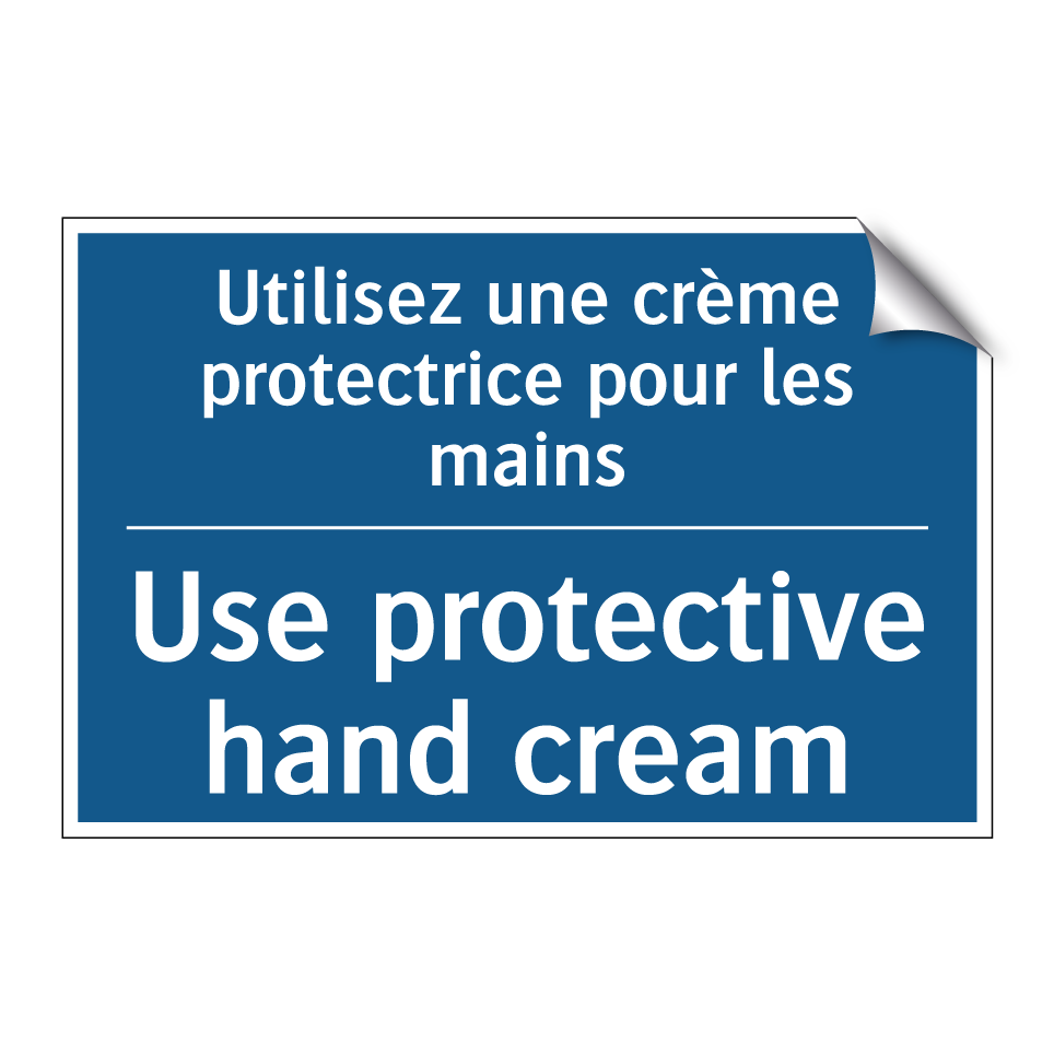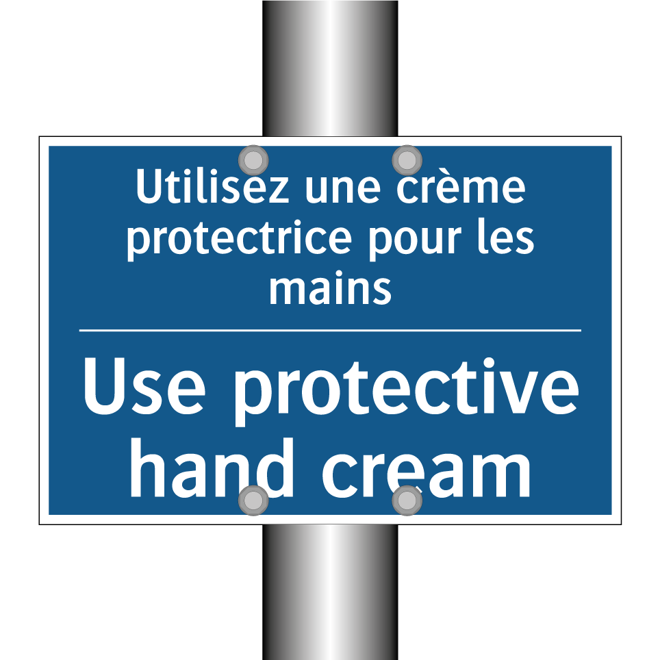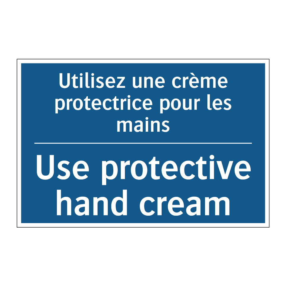 Panneau d'obligation bilingue avec texte en français : "Utilisez une crème protectrice pour les mains", et en anglais : "Use protective hand cream"