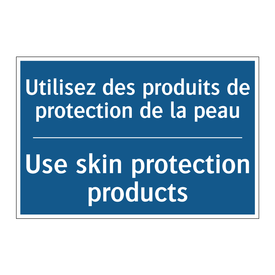 Panneau d'obligation bilingue avec texte en français : "Utilisez des produits de protection de la peau", et en anglais : "Use skin protection products"