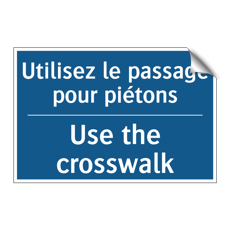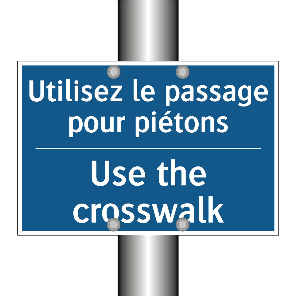 Panneau d'obligation bilingue avec texte en français : "Utilisez le passage pour piétons", et en anglais : "Use the crosswalk"