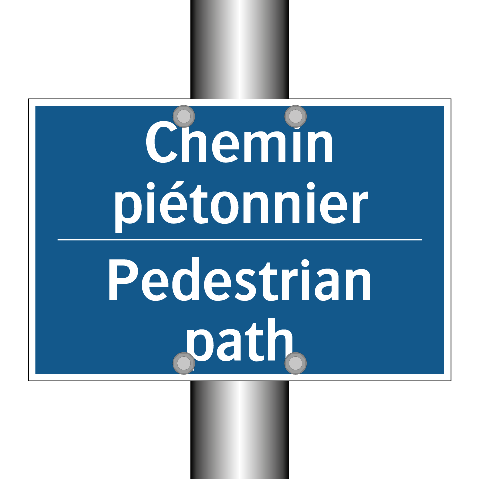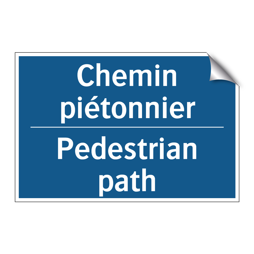 Panneau d'obligation bilingue avec texte en français : "Chemin piétonnier", et en anglais : "Pedestrian path"