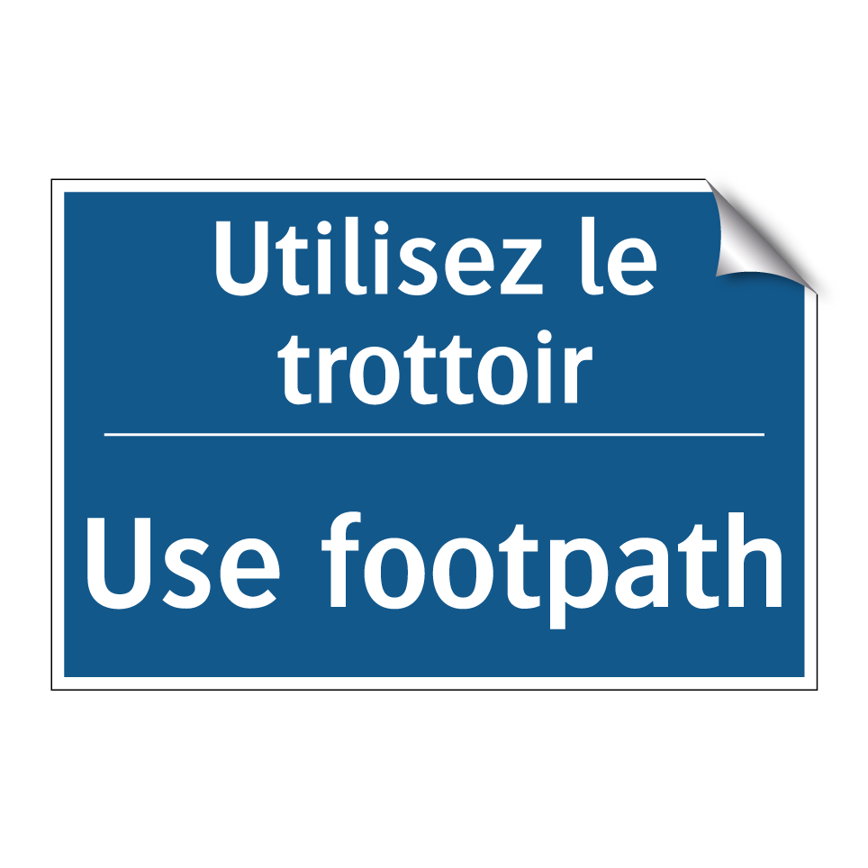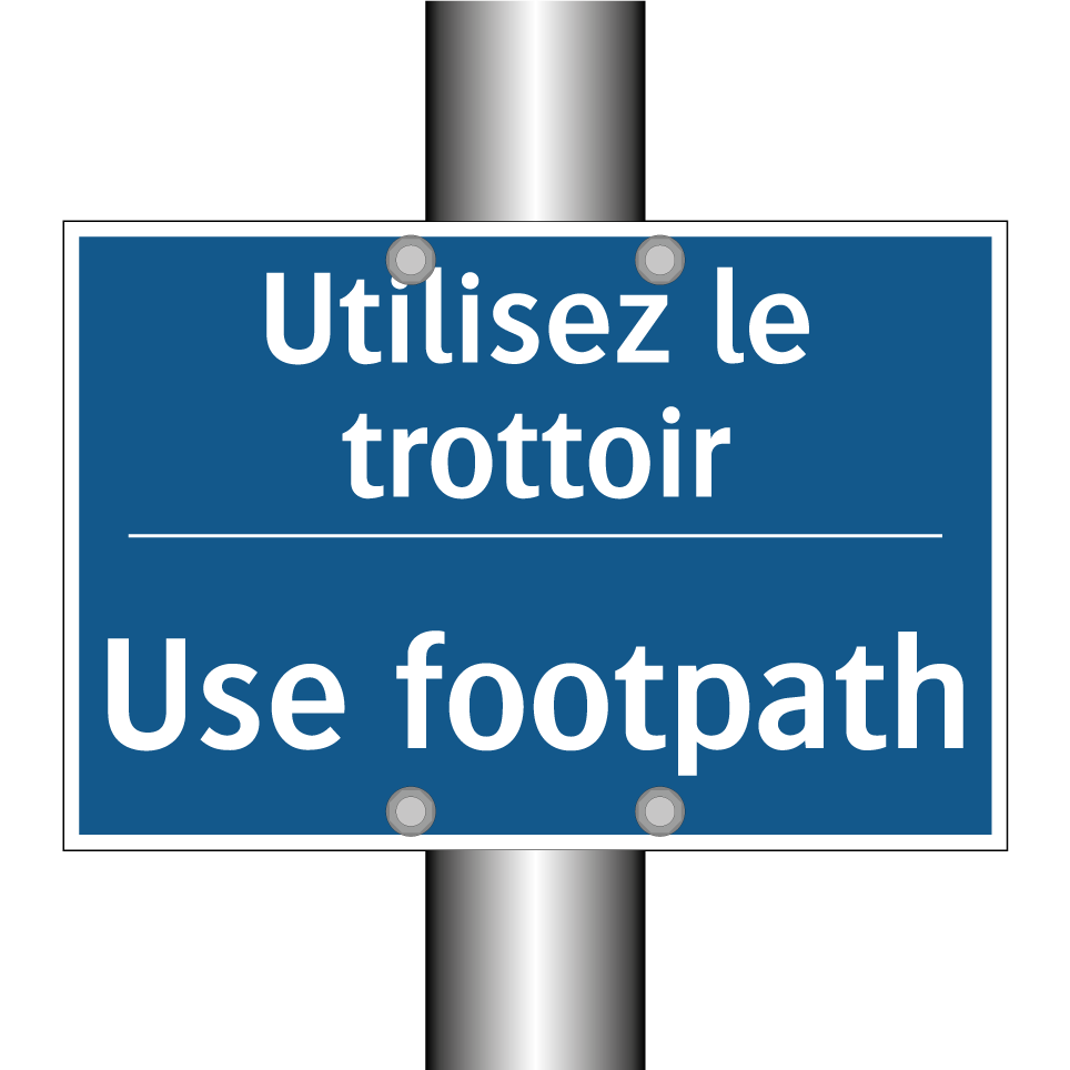 Panneau d'obligation bilingue avec texte en français : "Utilisez le trottoir", et en anglais : "Use footpath"