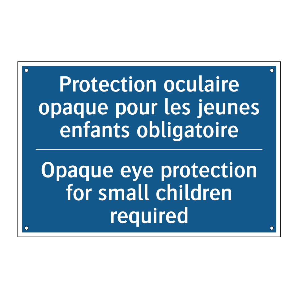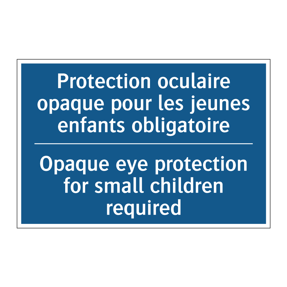 Panneau d'obligation bilingue avec texte en français : "Protection oculaire opaque pour les jeunes enfants obligatoire", et en anglais : "Opaque eye protection for small children required"