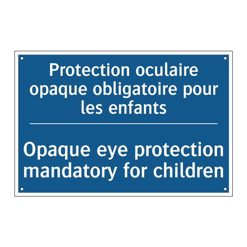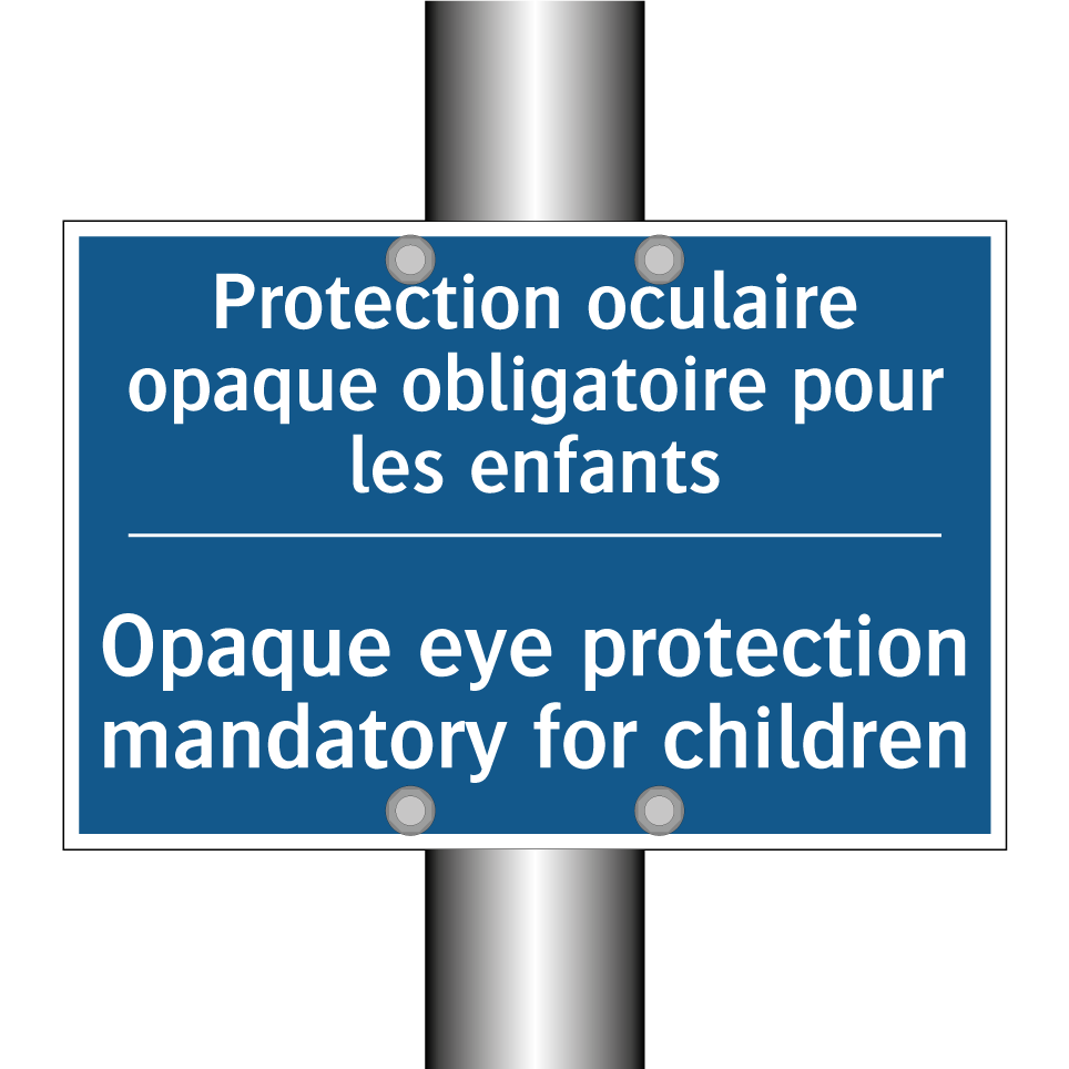 Panneau d'obligation bilingue avec texte en français : "Protection oculaire opaque obligatoire pour les enfants", et en anglais : "Opaque eye protection mandatory for children"