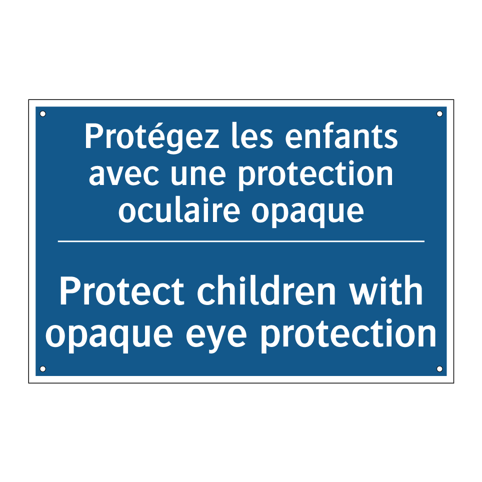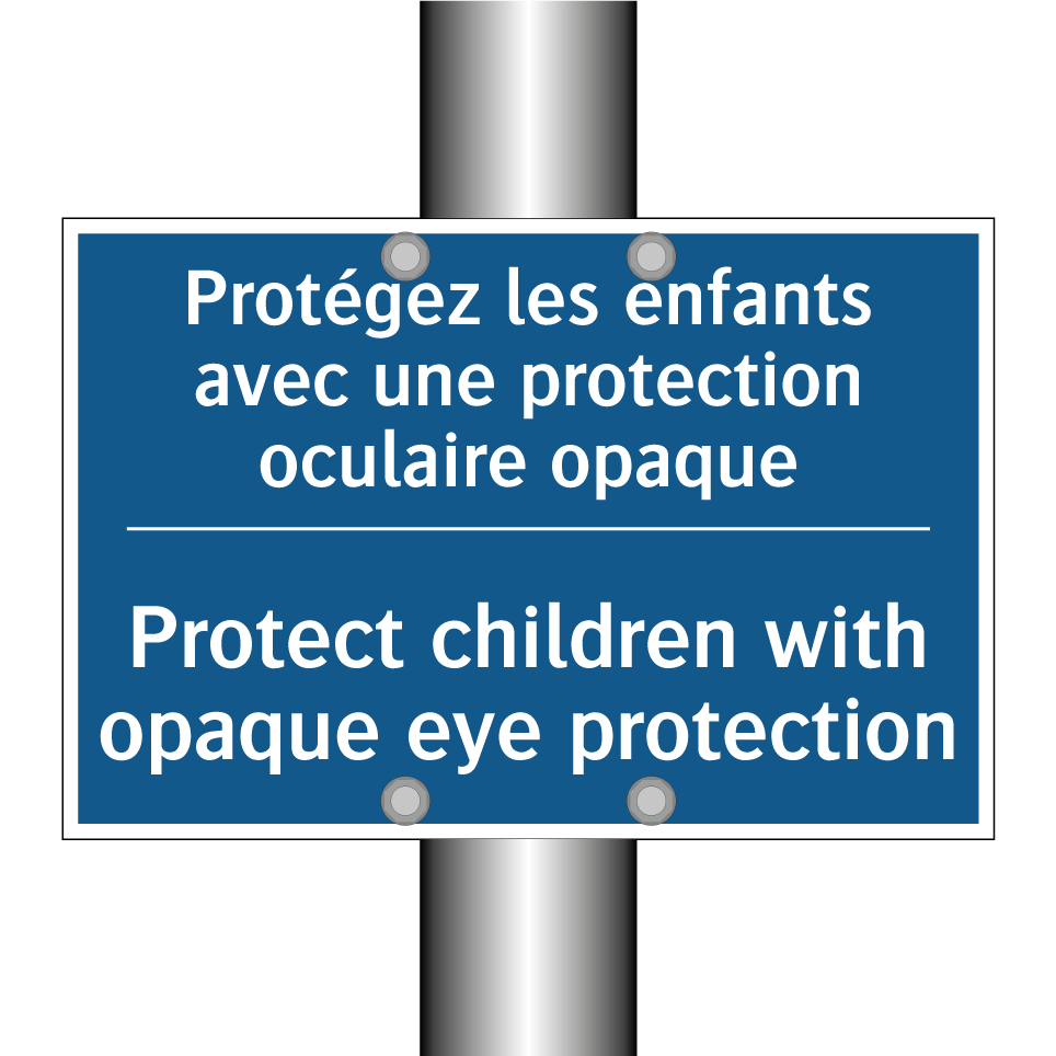 Panneau d'obligation bilingue avec texte en français : "Protégez les enfants avec une protection oculaire opaque", et en anglais : "Protect children with opaque eye protection"