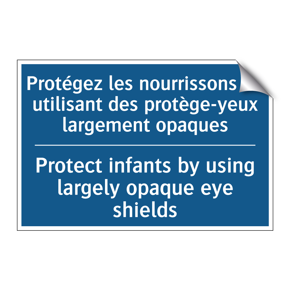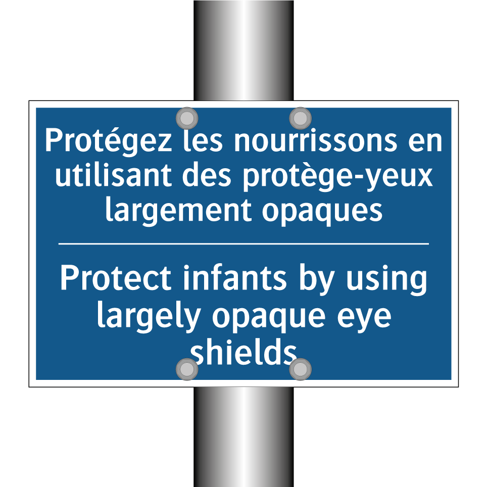 Panneau d'obligation bilingue avec texte en français : "Protégez les nourrissons en utilisant des protège-yeux largement opaques", et en anglais : "Protect infants by using largely opaque eye shields"