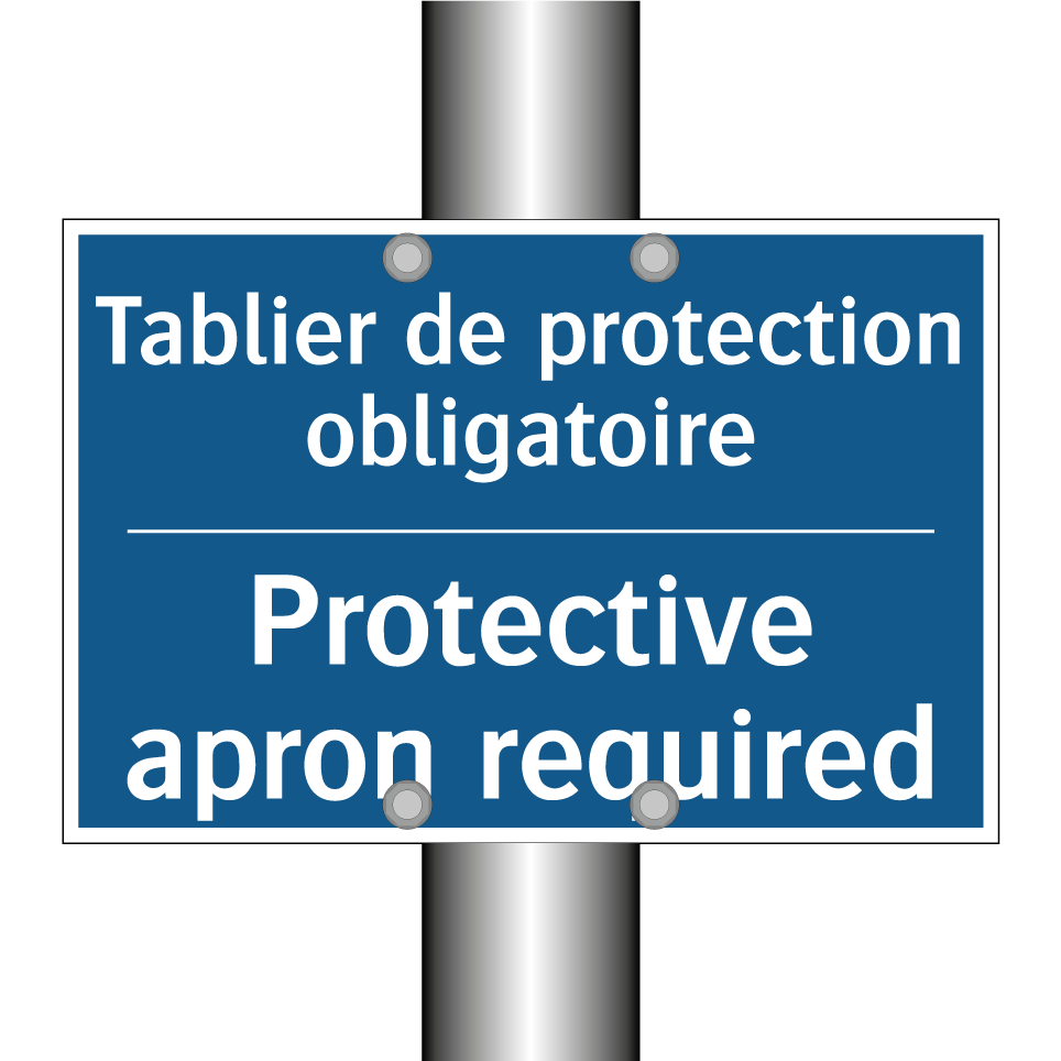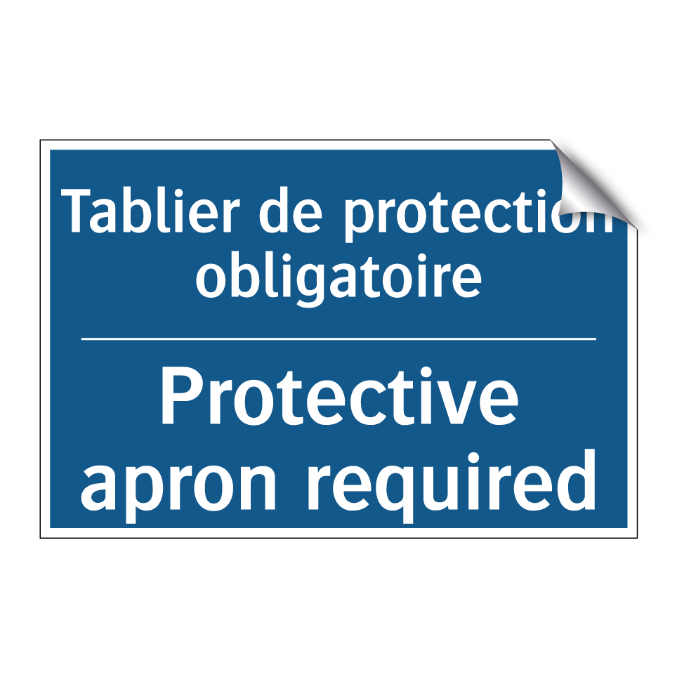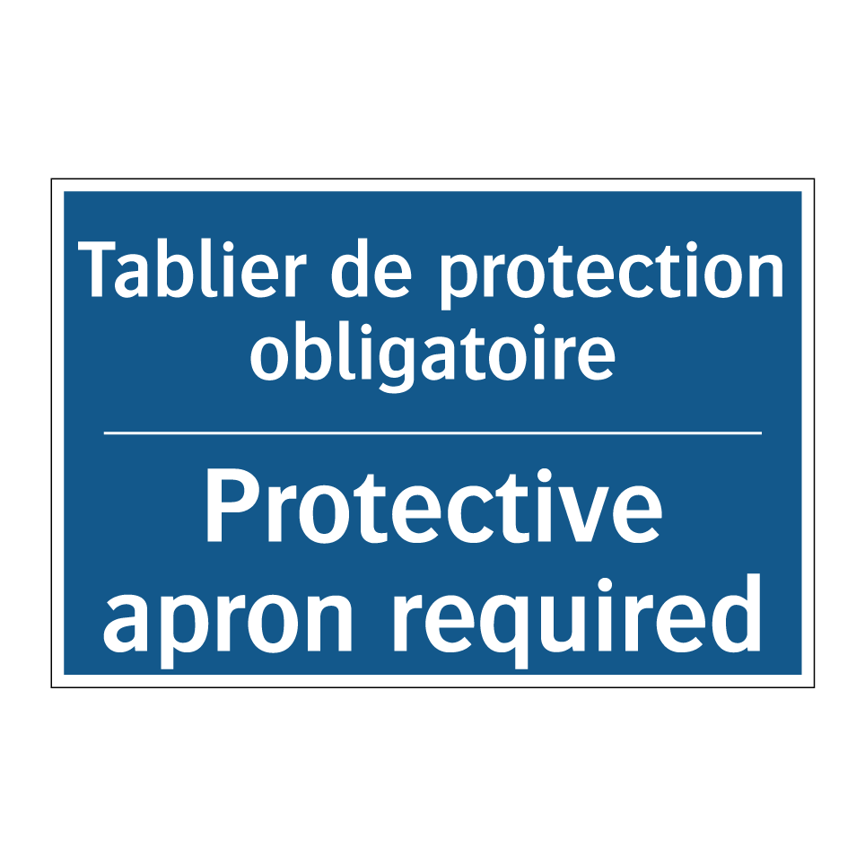 Panneau d'obligation bilingue avec texte en français : "Tablier de protection obligatoire", et en anglais : "Protective apron required"