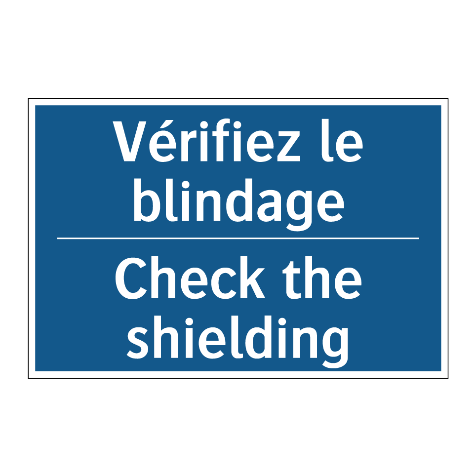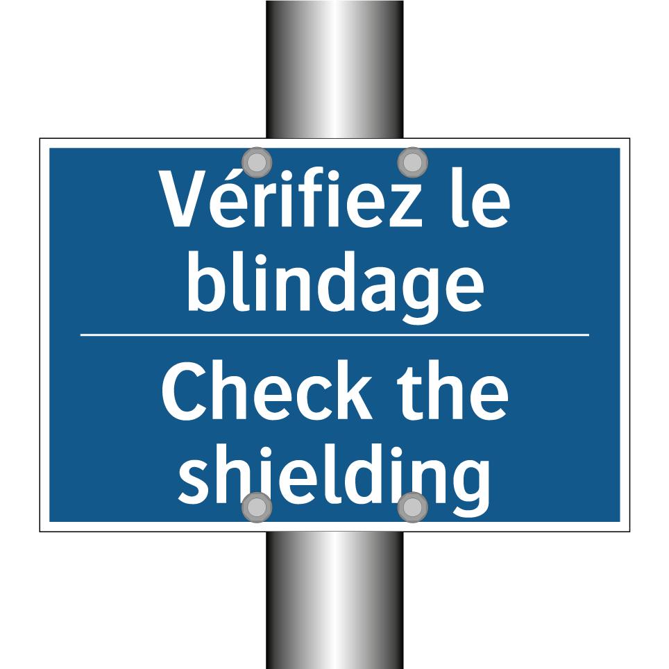 Panneau d'obligation bilingue avec texte en français : "Vérifiez le blindage", et en anglais : "Check the shielding"