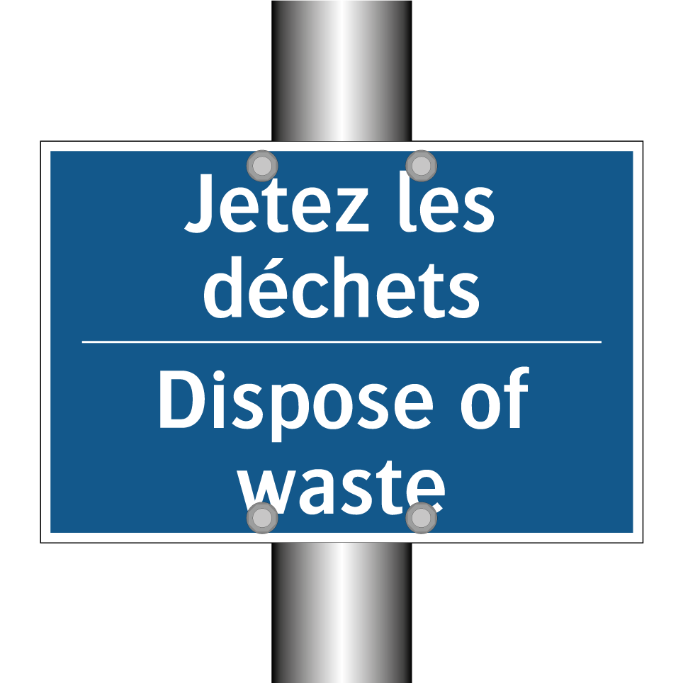 Panneau d'obligation bilingue avec texte en français : "Jetez les déchets", et en anglais : "Dispose of waste"