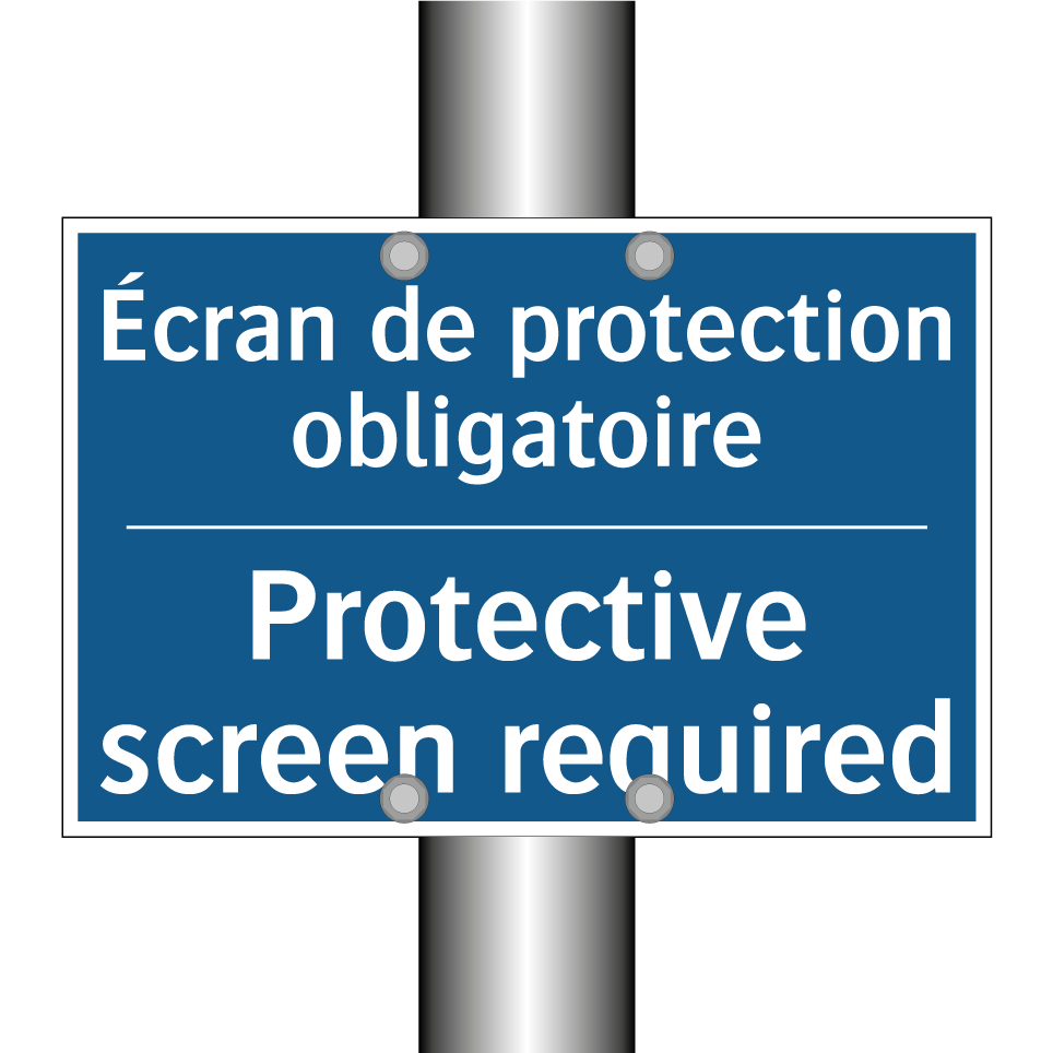 Panneau d'obligation bilingue avec texte en français : "Écran de protection obligatoire", et en anglais : "Protective screen required"