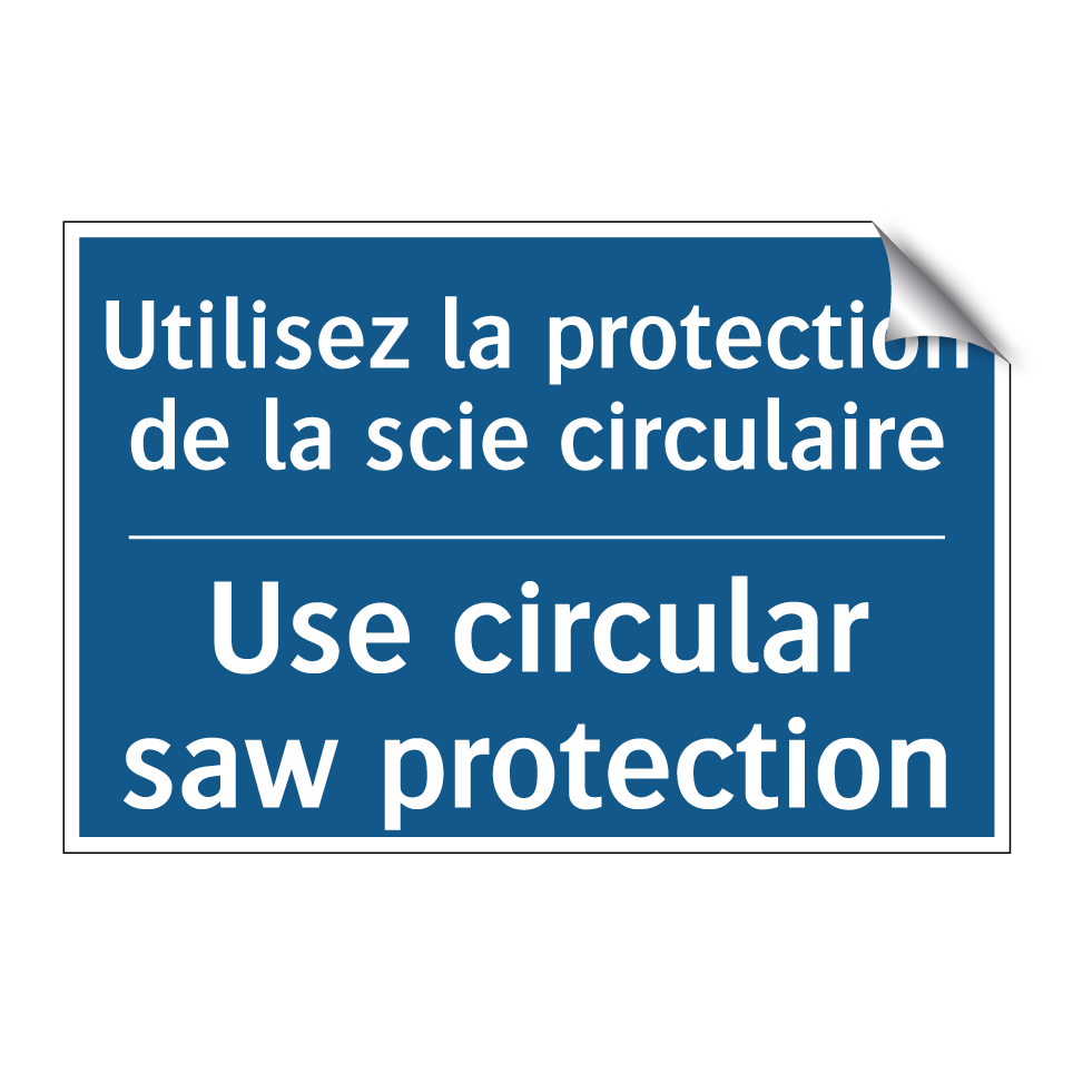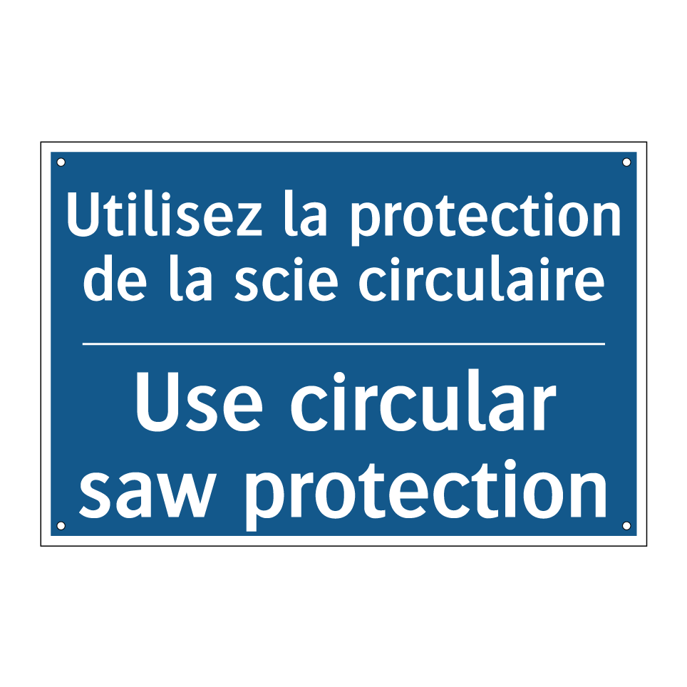 Panneau d'obligation bilingue avec texte en français : "Utilisez la protection de la scie circulaire", et en anglais : "Use circular saw protection"