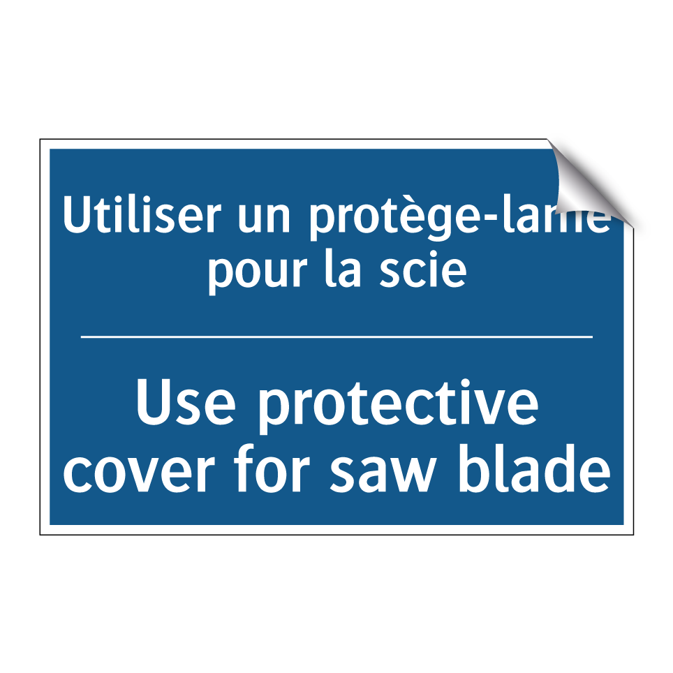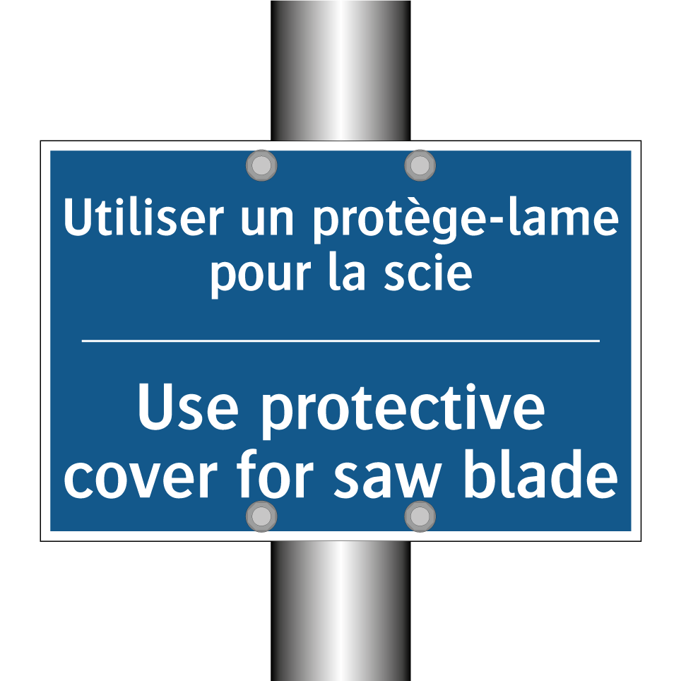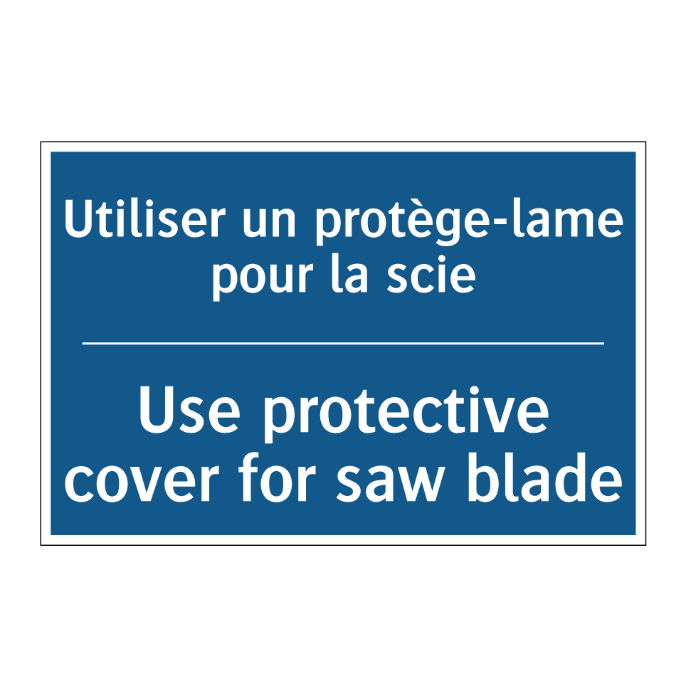 Panneau d'obligation bilingue avec texte en français : "Utiliser un protège-lame pour la scie", et en anglais : "Use protective cover for saw blade"