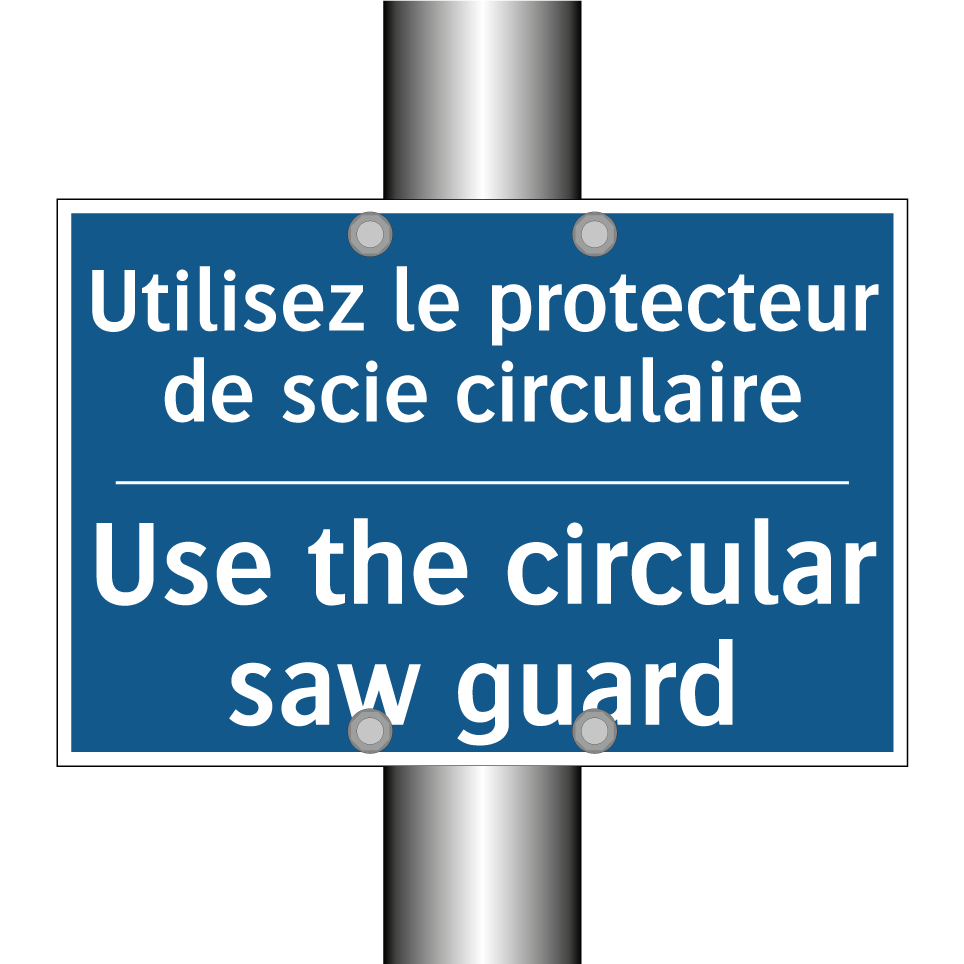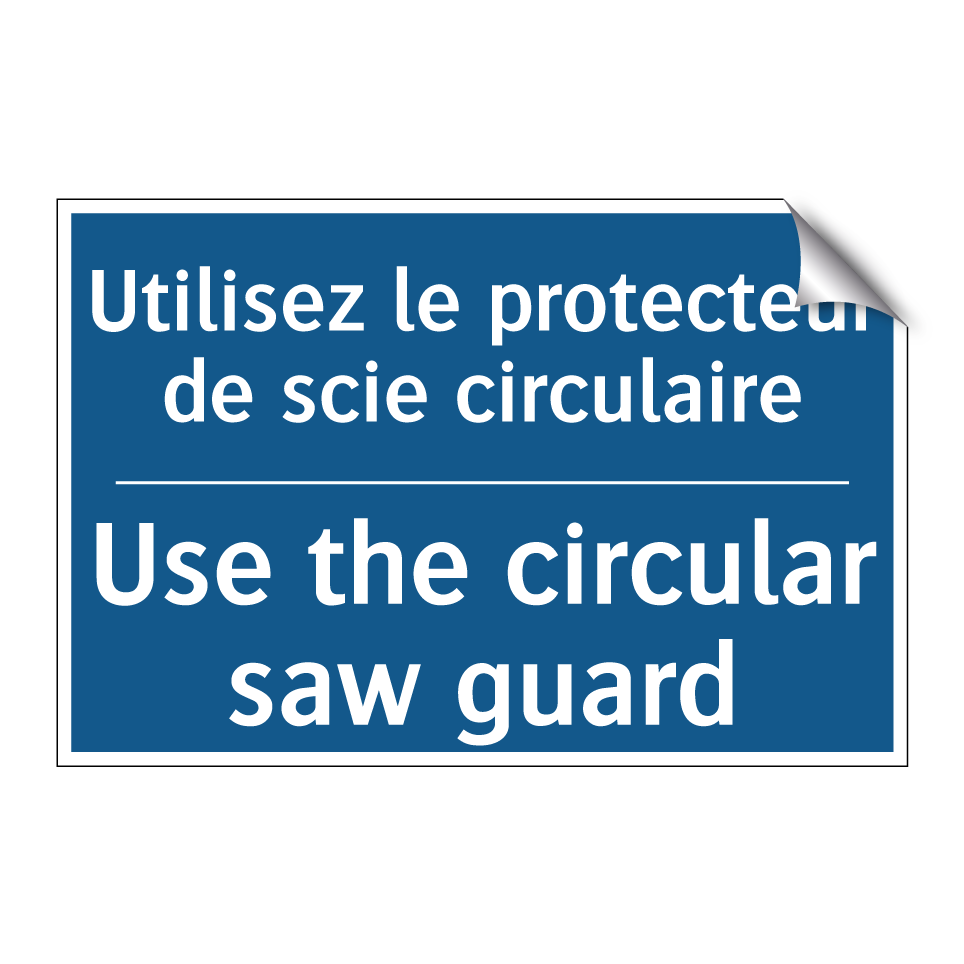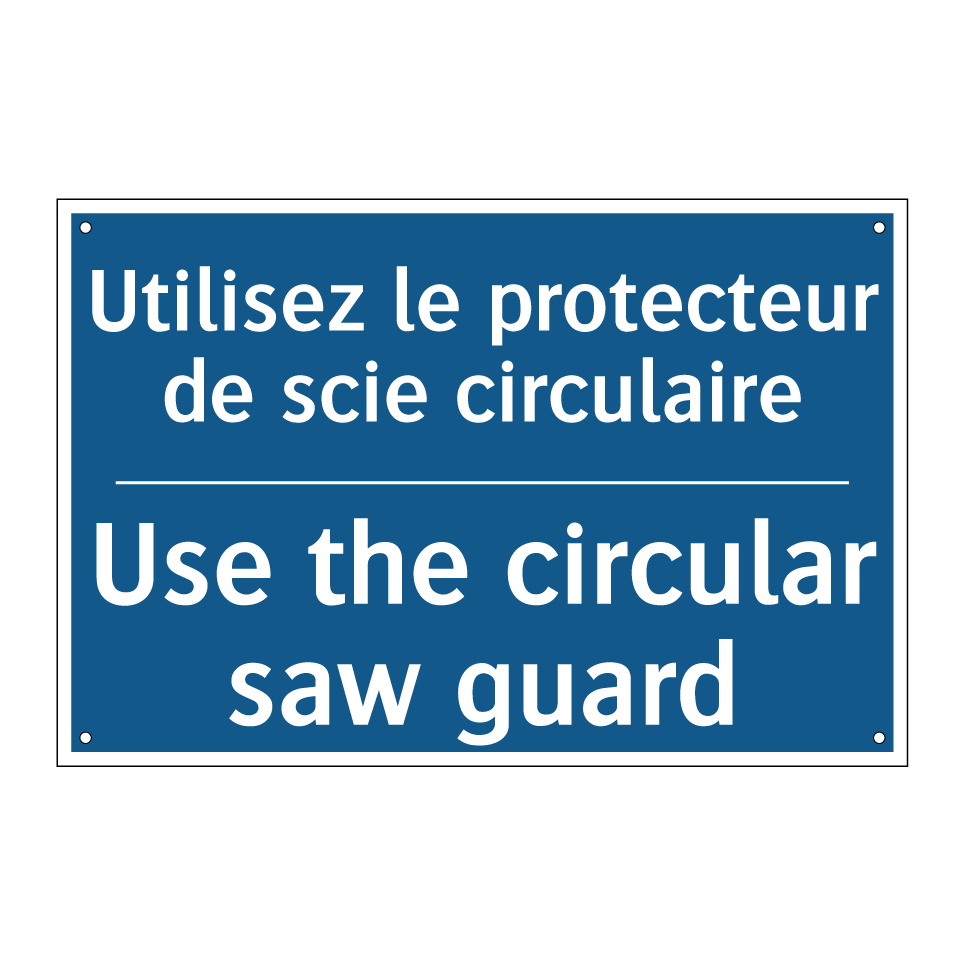 Panneau d'obligation bilingue avec texte en français : "Utilisez le protecteur de scie circulaire", et en anglais : "Use the circular saw guard"