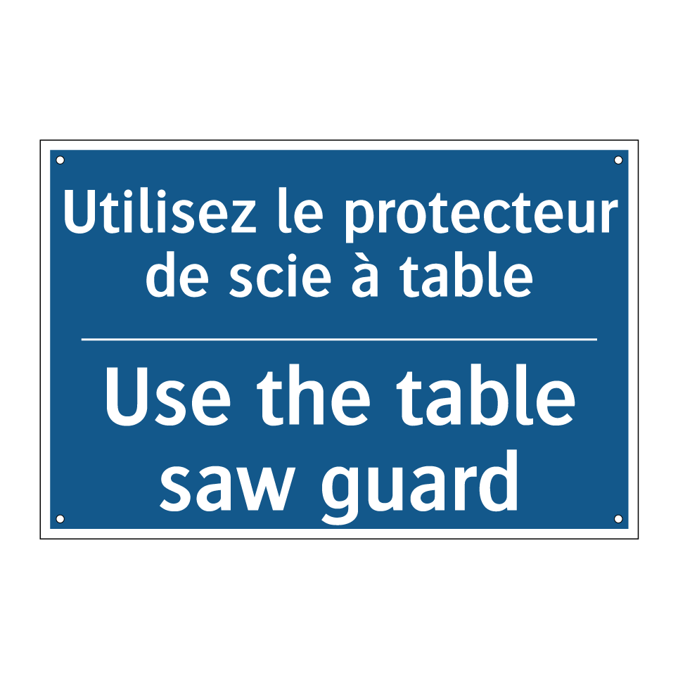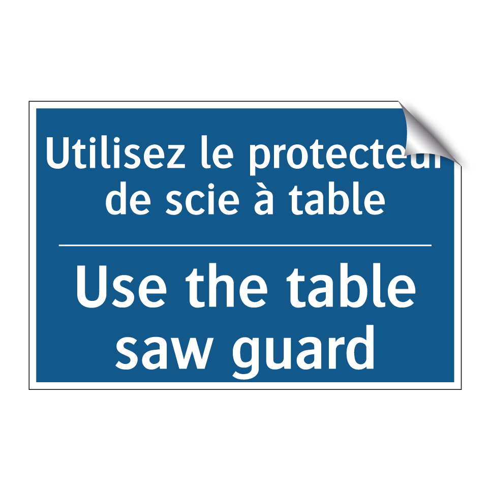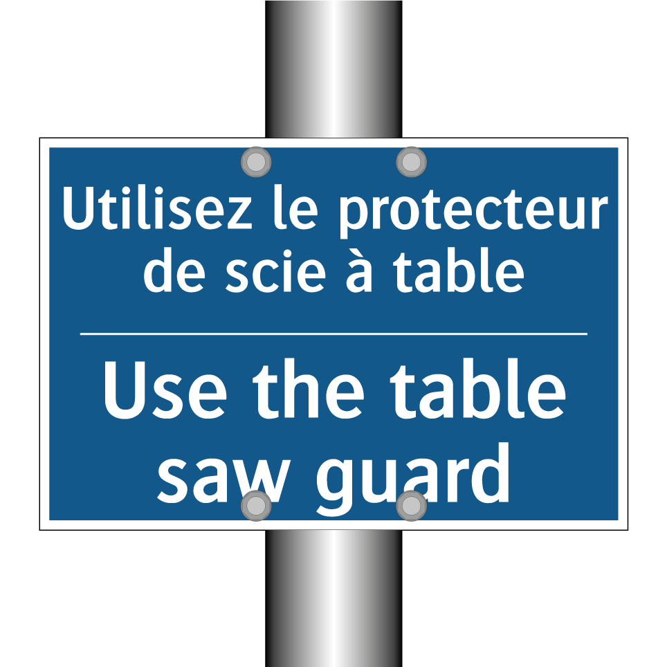 Panneau d'obligation bilingue avec texte en français : "Utilisez le protecteur de scie à table", et en anglais : "Use the table saw guard"