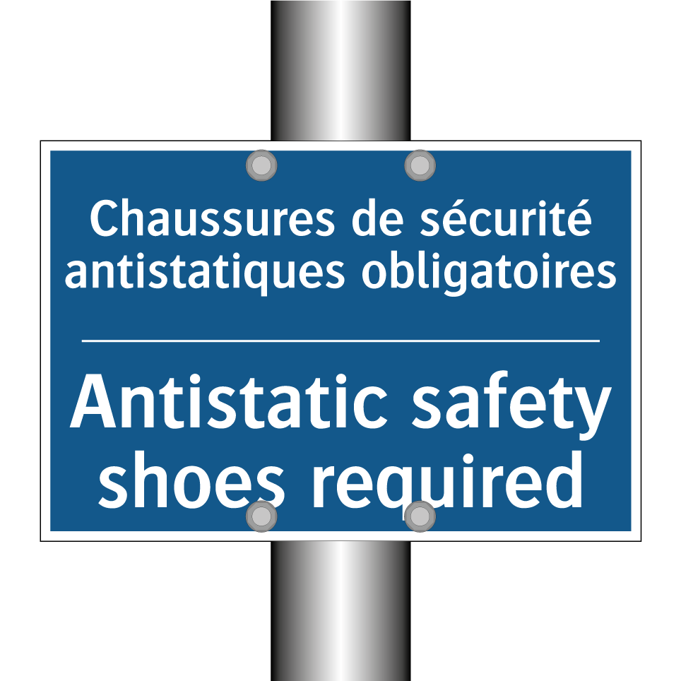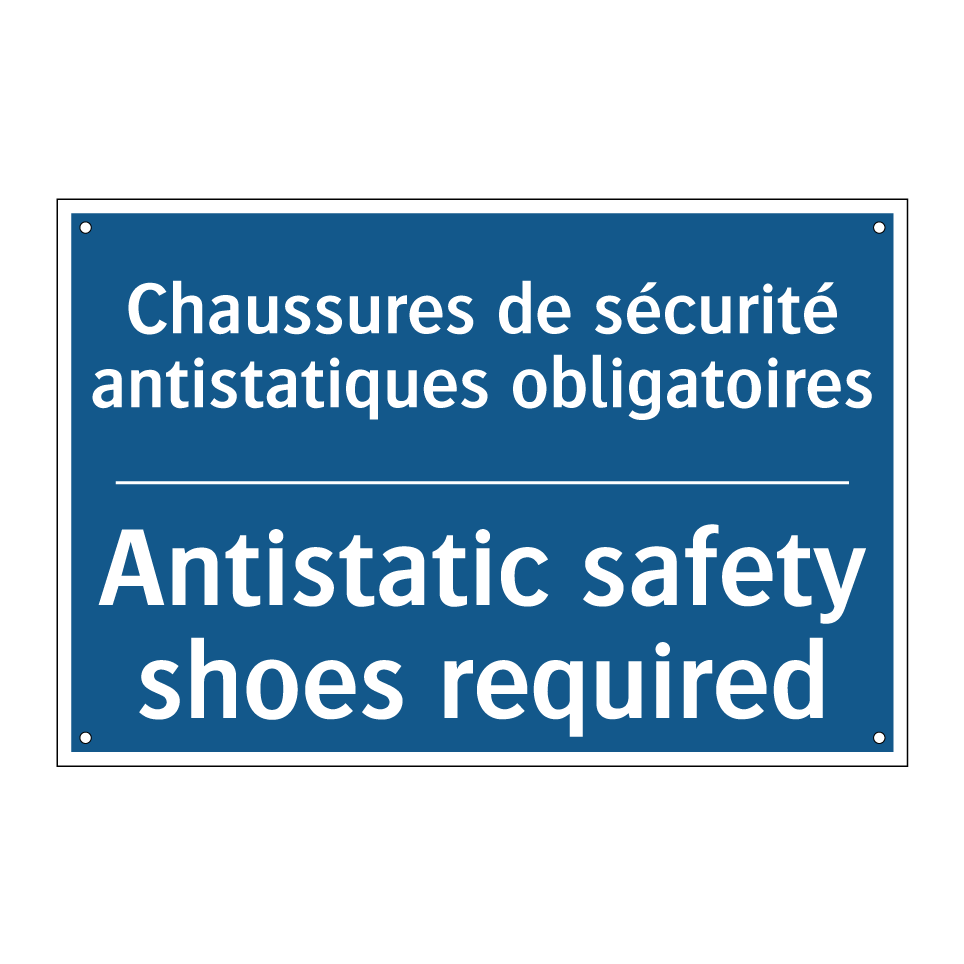 Panneau d'obligation bilingue avec texte en français : "Chaussures de sécurité antistatiques obligatoires", et en anglais : "Antistatic safety shoes required"