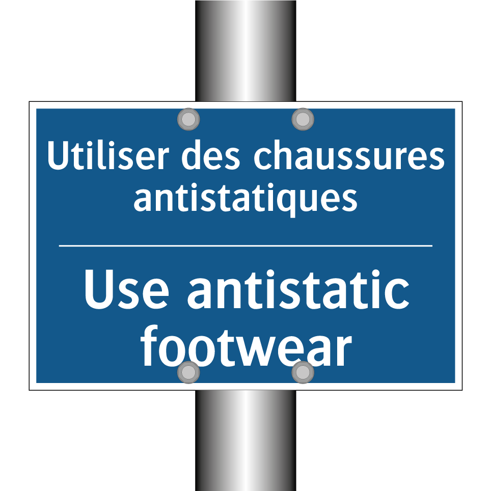 Panneau d'obligation bilingue avec texte en français : "Utiliser des chaussures antistatiques", et en anglais : "Use antistatic footwear"