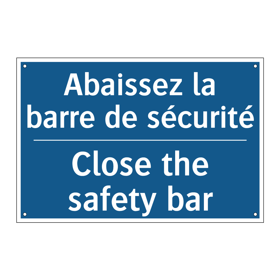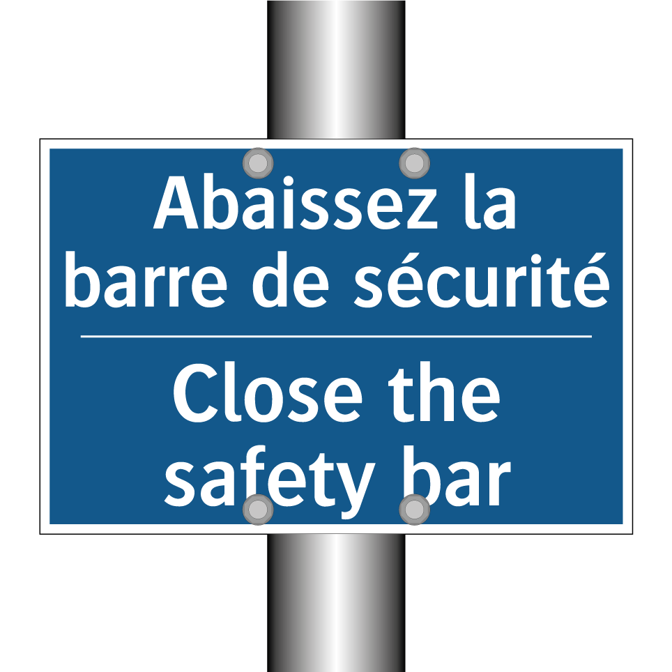Panneau d'obligation bilingue avec texte en français : "Abaissez la barre de sécurité", et en anglais : "Close the safety bar"