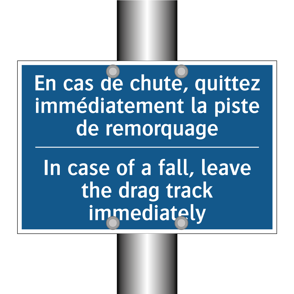 Panneau d'obligation bilingue avec texte en français : "En cas de chute, quittez immédiatement la piste de remorquage", et en anglais : "In case of a fall, leave the drag track immediately"