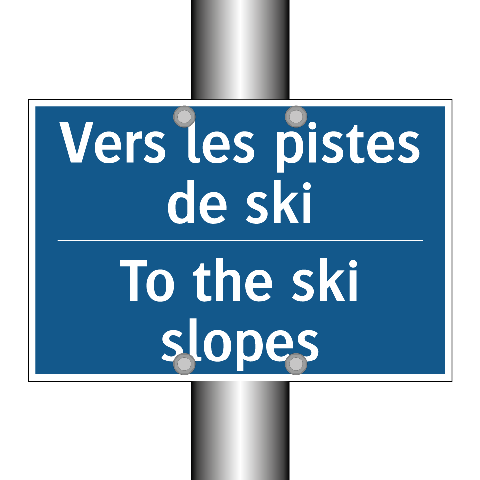 Panneau d'obligation bilingue avec texte en français : "Vers les pistes de ski", et en anglais : "To the ski slopes"
