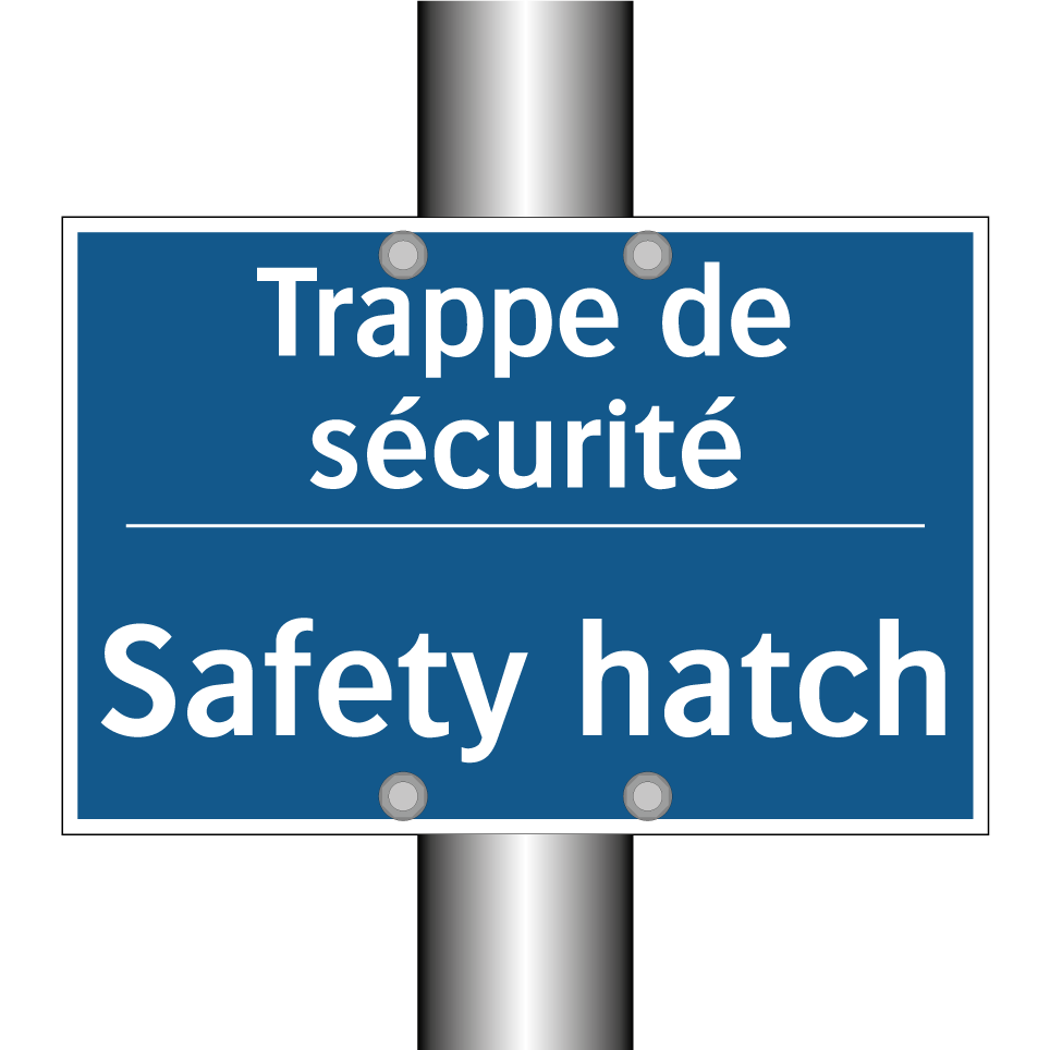 Panneau d'obligation bilingue avec texte en français : "Trappe de sécurité", et en anglais : "Safety hatch"