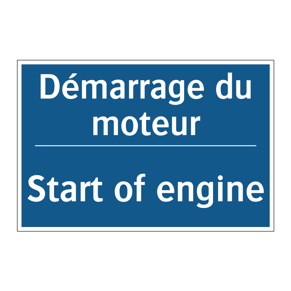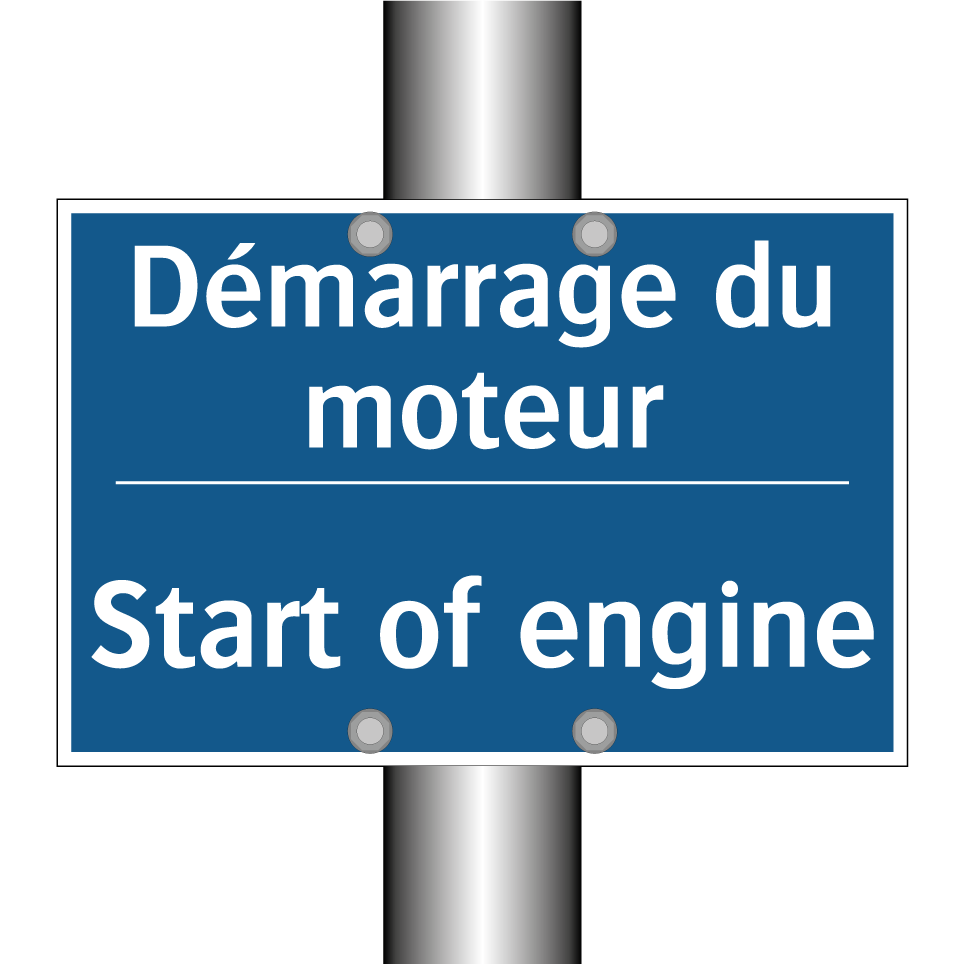 Panneau d'obligation bilingue avec texte en français : "Démarrage du moteur", et en anglais : "Start of engine"