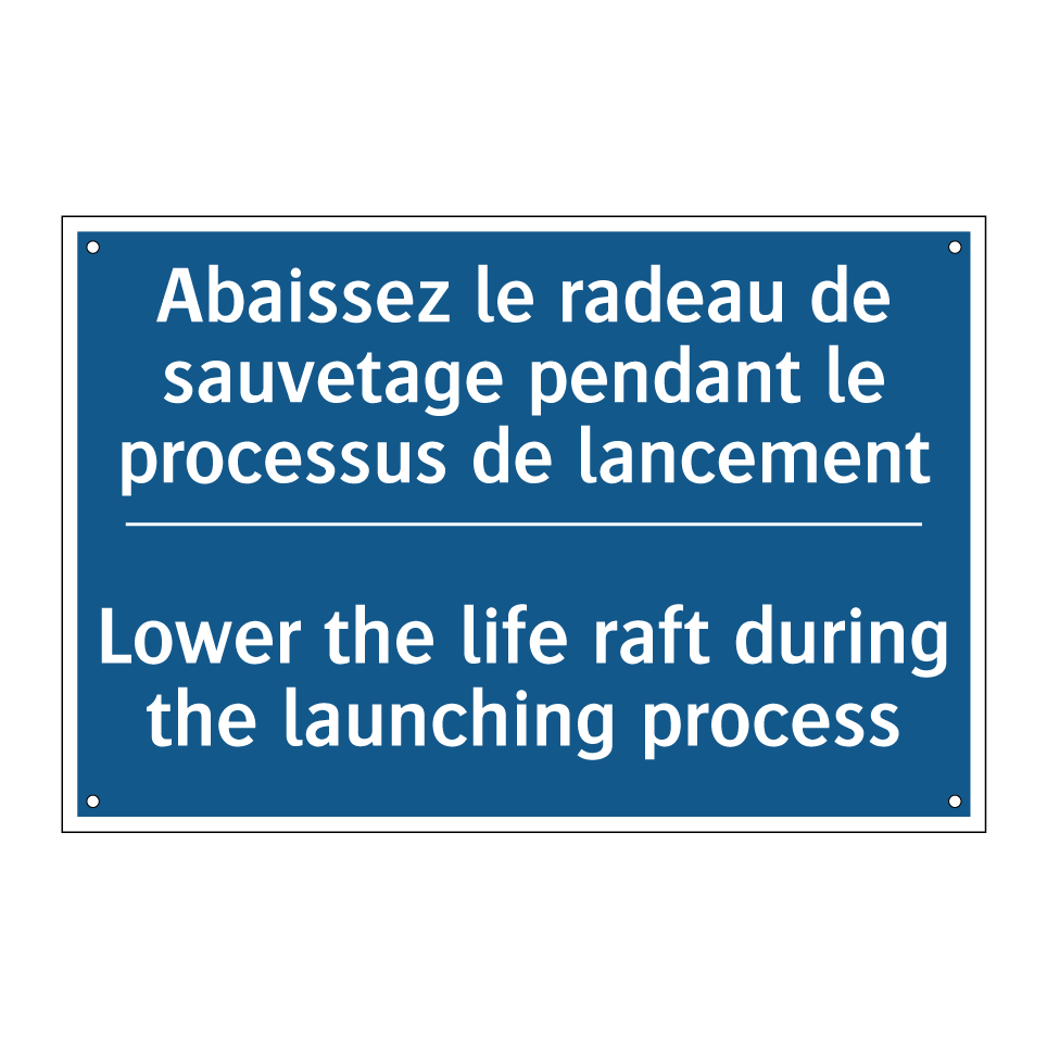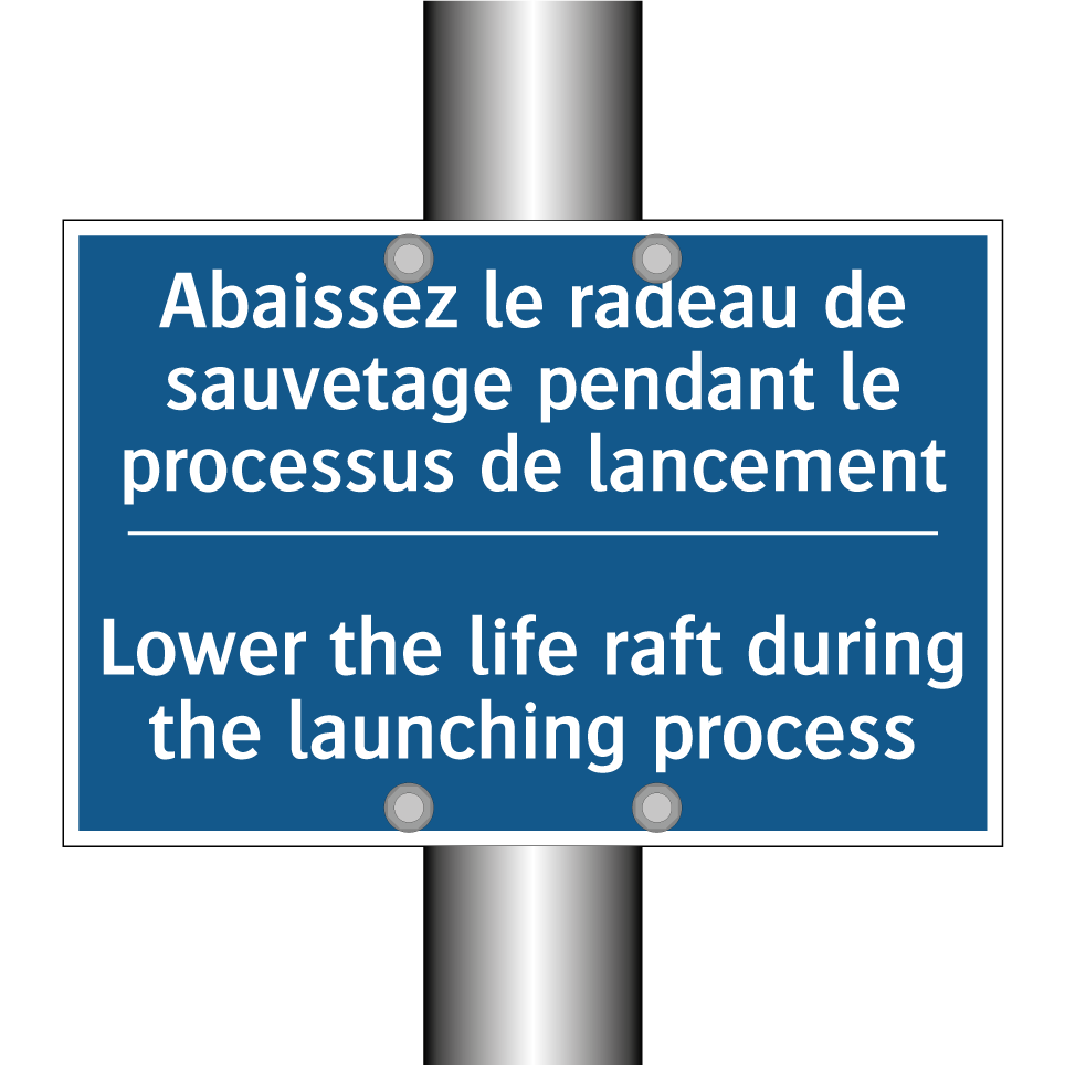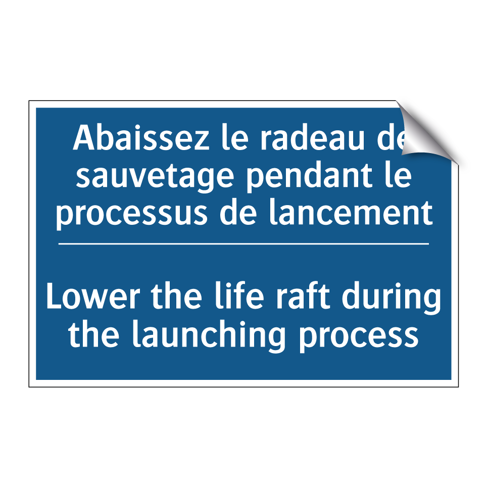 Panneau d'obligation bilingue avec texte en français : "Abaissez le radeau de sauvetage pendant le processus de lancement", et en anglais : "Lower the life raft during the launching process"