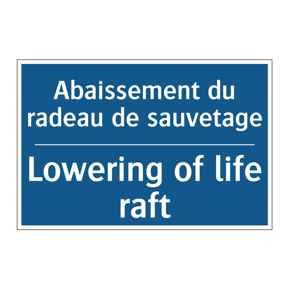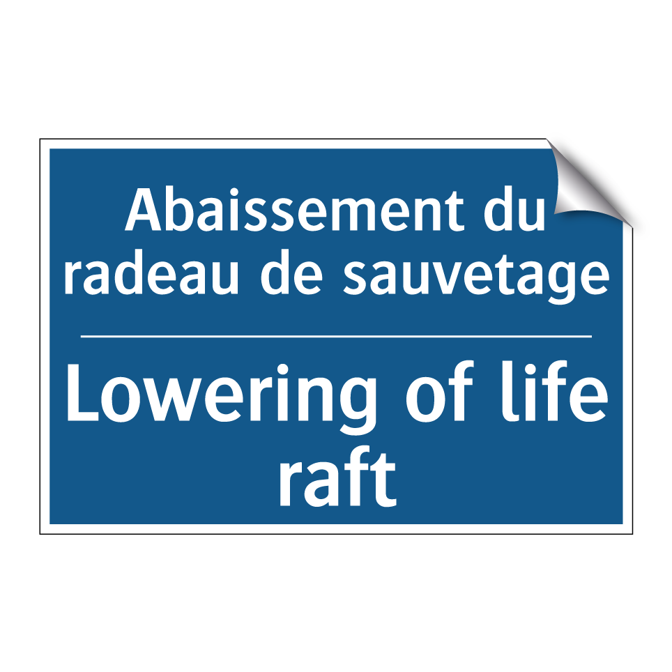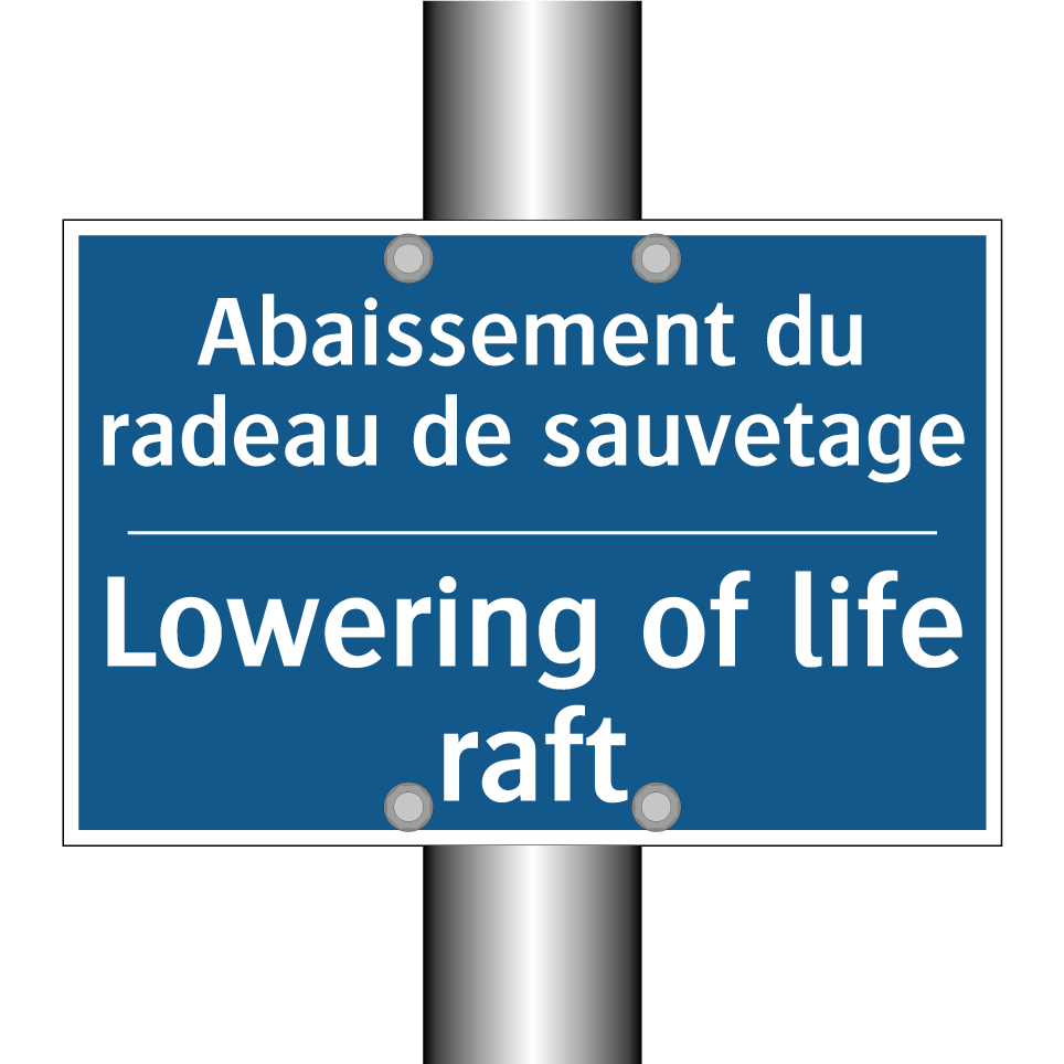 Panneau d'obligation bilingue avec texte en français : "Abaissement du radeau de sauvetage", et en anglais : "Lowering of life raft"