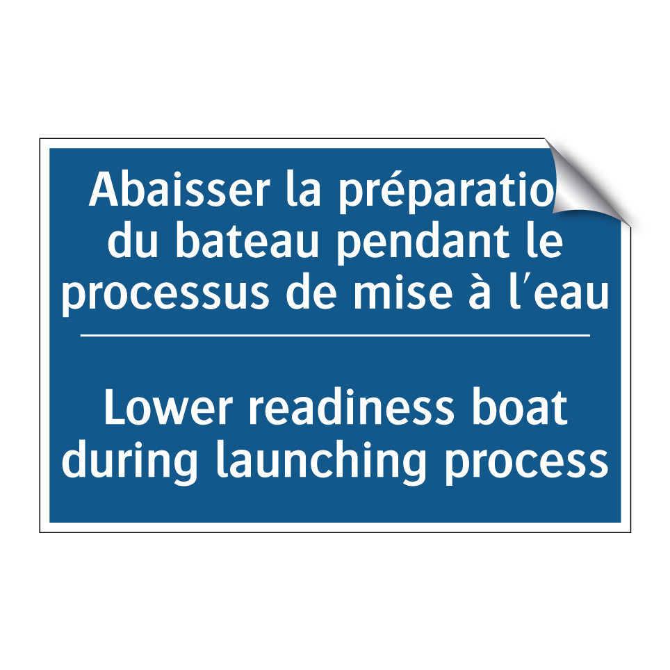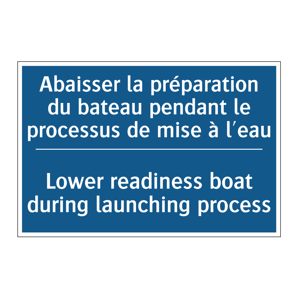 Panneau d'obligation bilingue avec texte en français : "Abaisser la préparation du bateau pendant le processus de mise à l'eau", et en anglais : "Lower readiness boat during launching process"