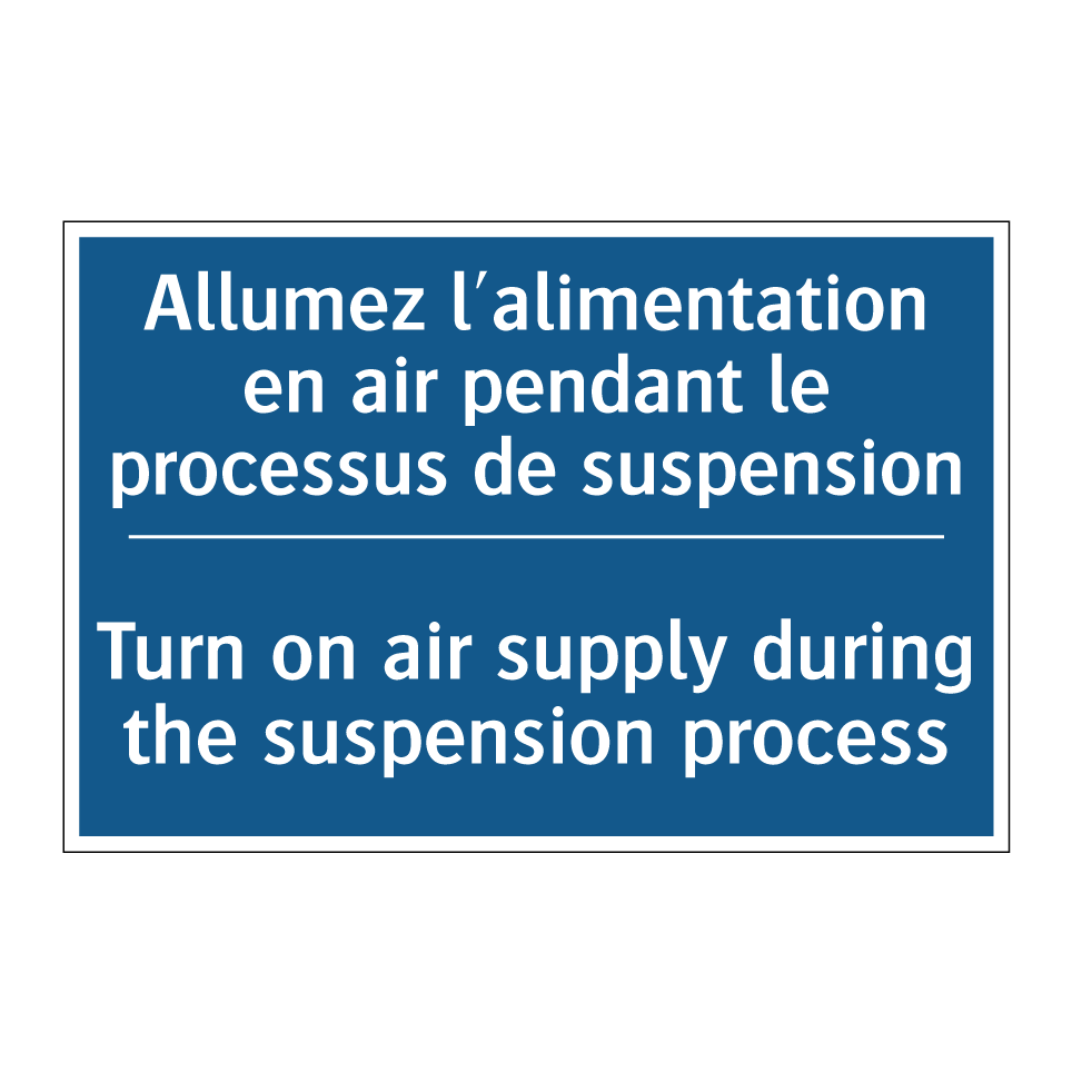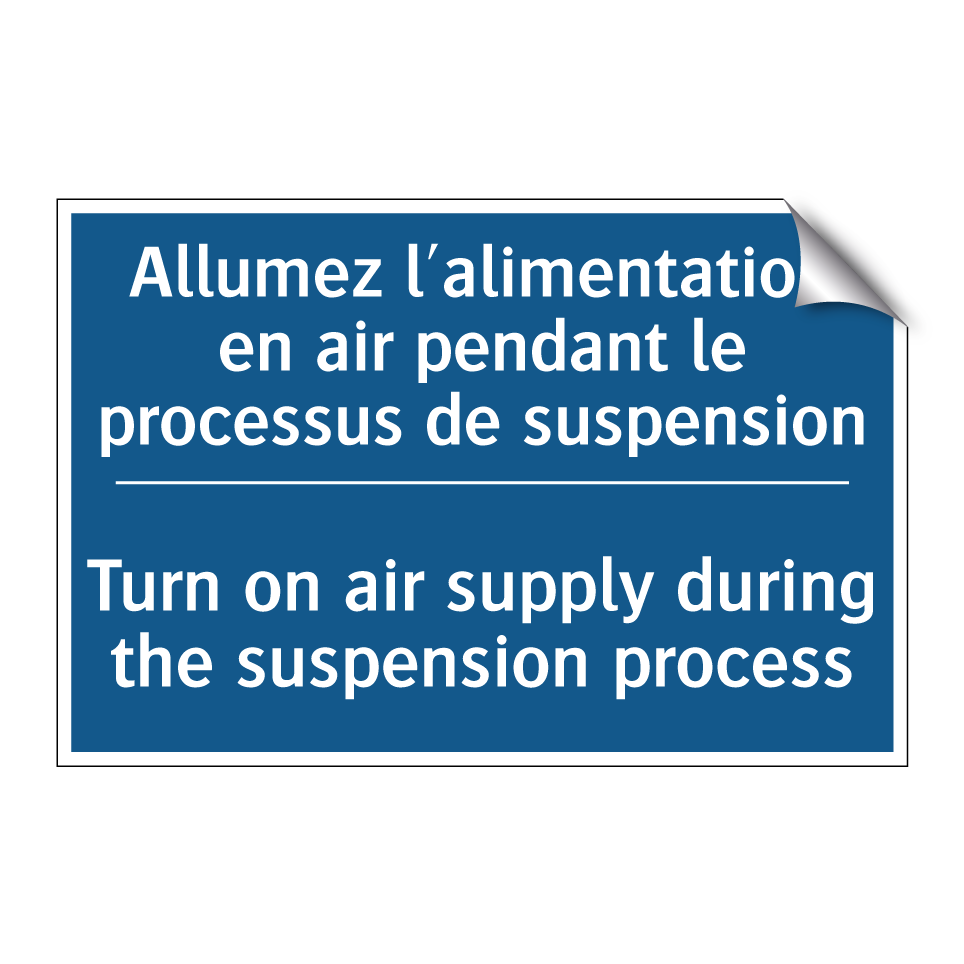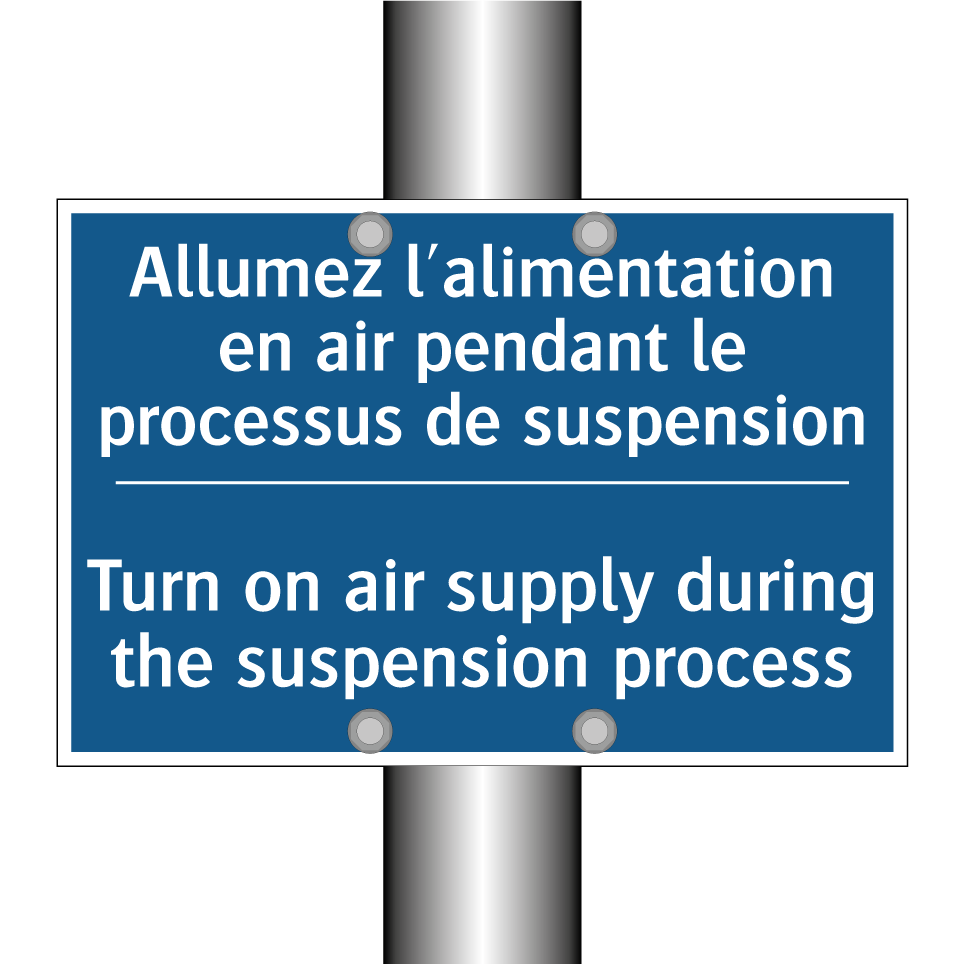 Panneau d'obligation bilingue avec texte en français : "Allumez l'alimentation en air pendant le processus de suspension", et en anglais : "Turn on air supply during the suspension process"