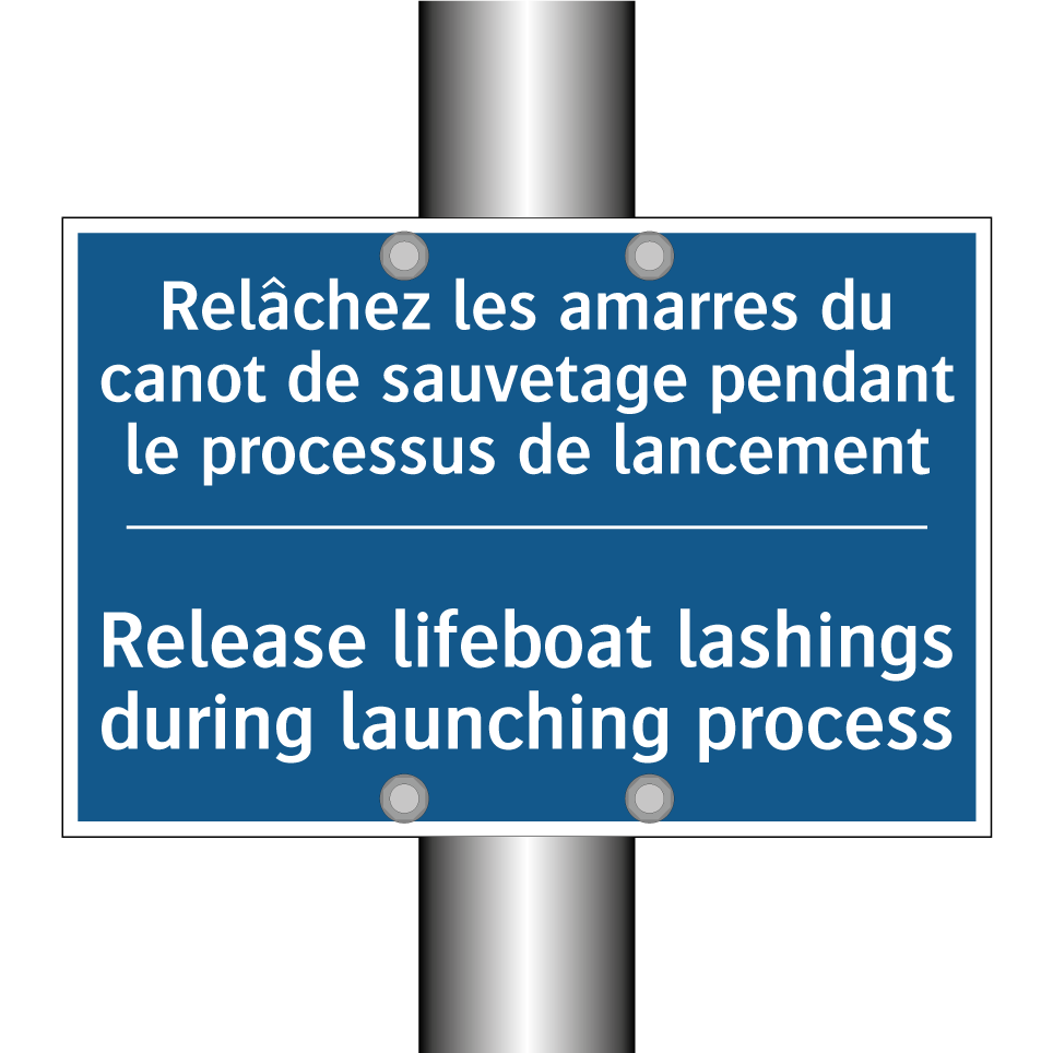 Panneau d'obligation bilingue avec texte en français : "Relâchez les amarres du canot de sauvetage pendant le processus de lancement", et en anglais : "Release lifeboat lashings during launching process"