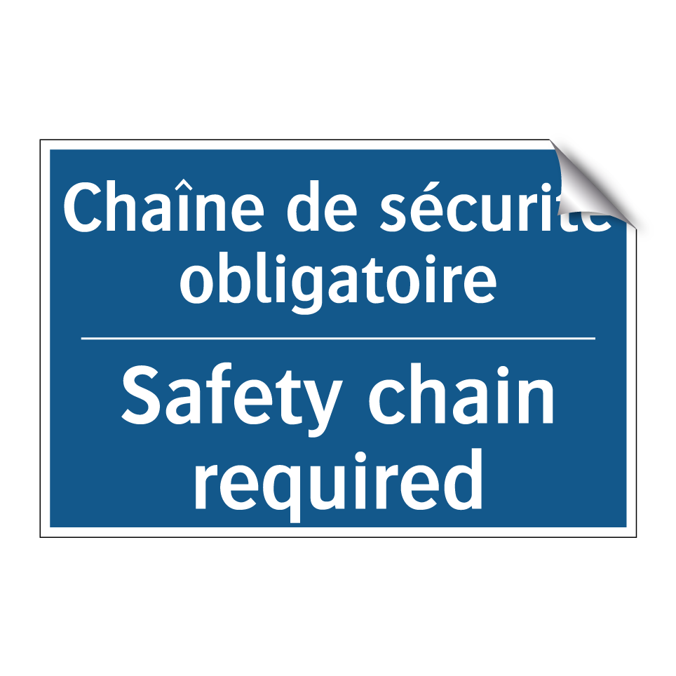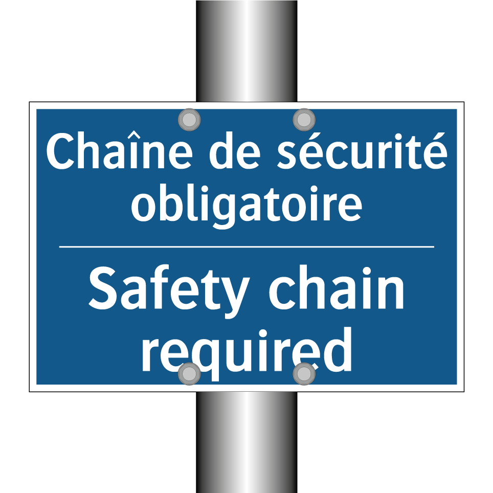 Panneau d'obligation bilingue avec texte en français : "Chaîne de sécurité obligatoire", et en anglais : "Safety chain required"