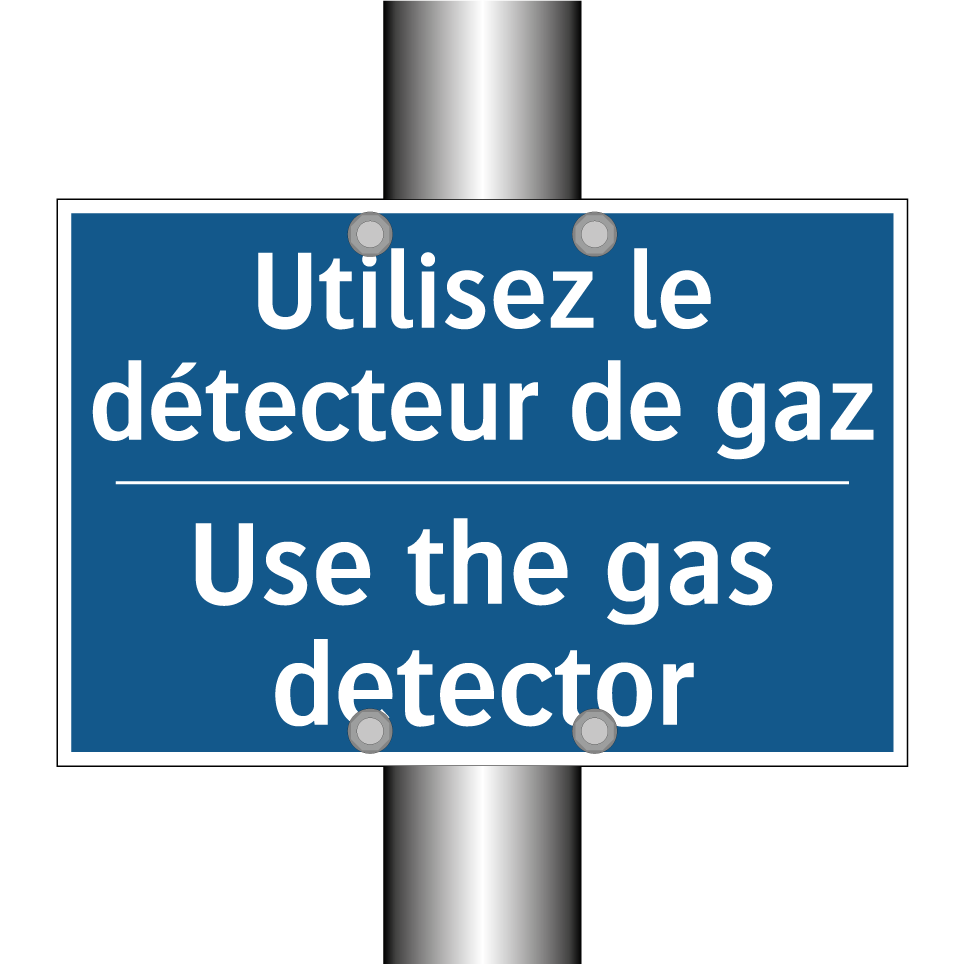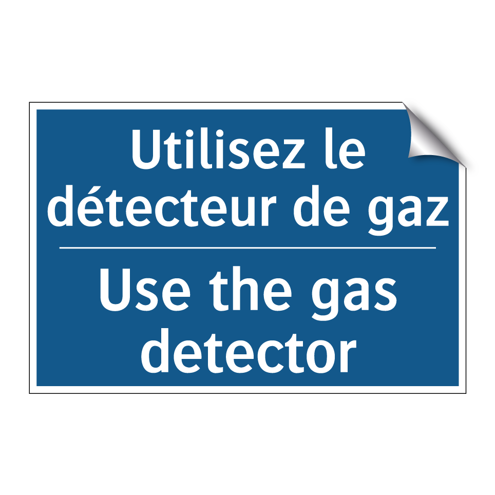 Panneau d'obligation bilingue avec texte en français : "Utilisez le détecteur de gaz", et en anglais : "Use the gas detector"