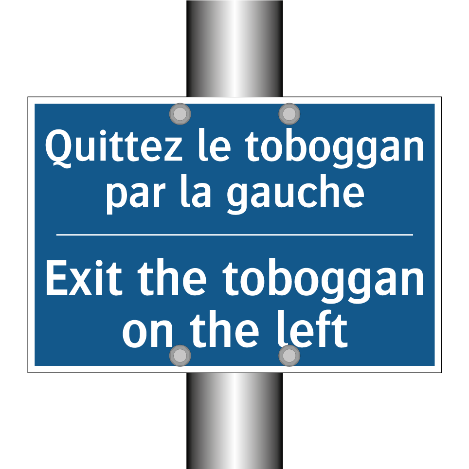 Panneau d'obligation bilingue avec texte en français : "Quittez le toboggan par la gauche", et en anglais : "Exit the toboggan on the left"