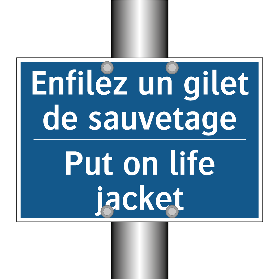 Panneau d'obligation bilingue avec texte en français : "Enfilez un gilet de sauvetage", et en anglais : "Put on life jacket"