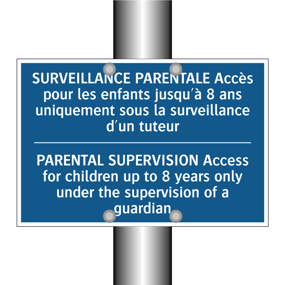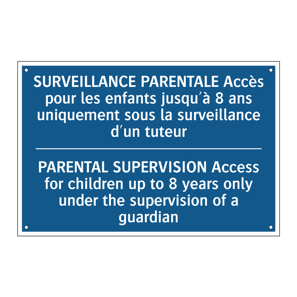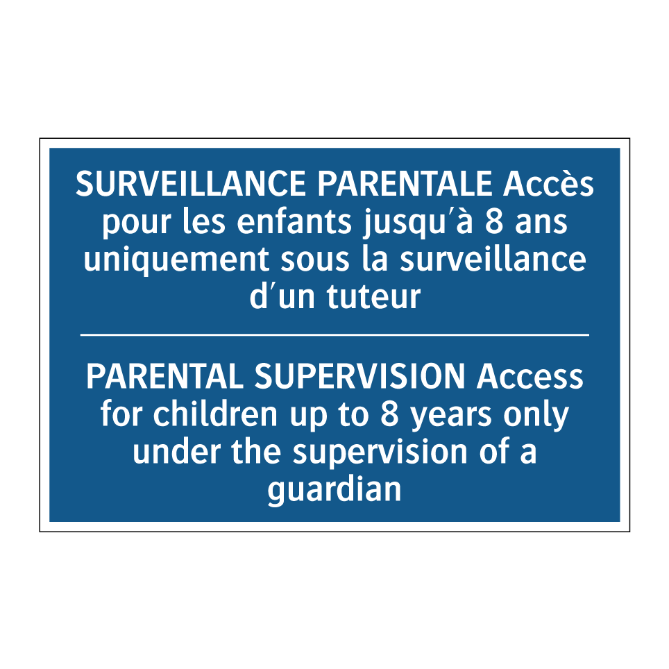 Panneau d'obligation bilingue avec texte en français : "SURVEILLANCE PARENTALE Accès pour les enfants jusqu'à 8 ans uniquement sous la surveillance d'un tuteur", et en anglais : "PARENTAL SUPERVISION Access for children up to 8 years only under the supervision of a guardian"
