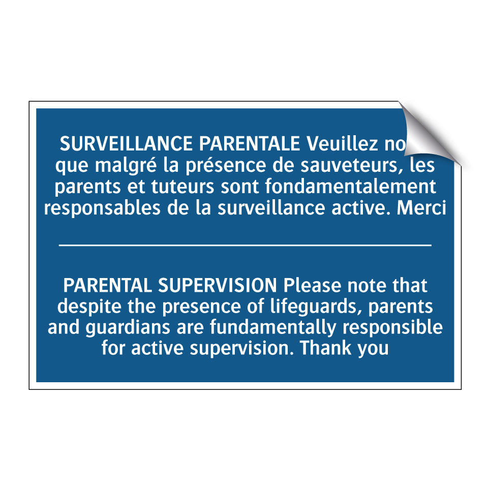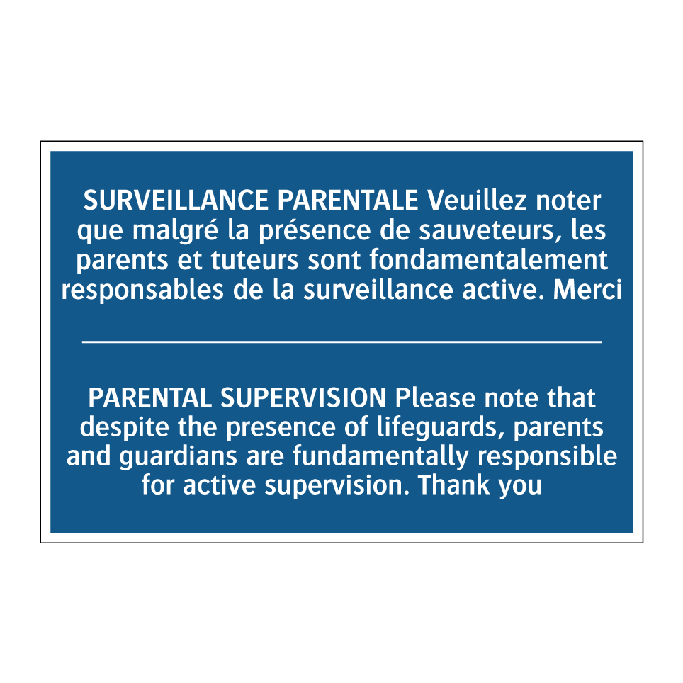 Panneau d'obligation bilingue avec texte en français : "SURVEILLANCE PARENTALE Veuillez noter que malgré la présence de sauveteurs, les parents et tuteurs sont fondamentalement responsables de la surveillance active. Merci", et en anglais : "PARENTAL SUPERVISION Please note that despite the presence of lifeguards, parents and guardians are fundamentally responsible for active supervision. Thank you"