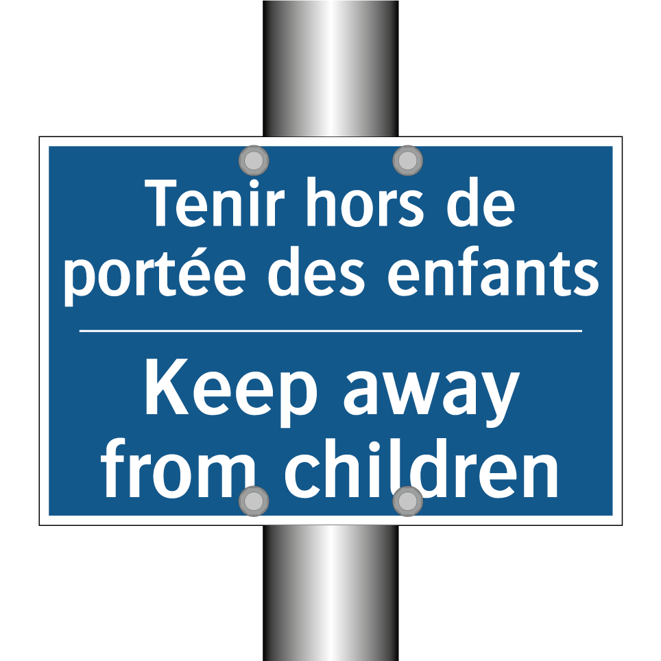 Panneau d'obligation bilingue avec texte en français : "Tenir hors de portée des enfants", et en anglais : "Keep away from children"