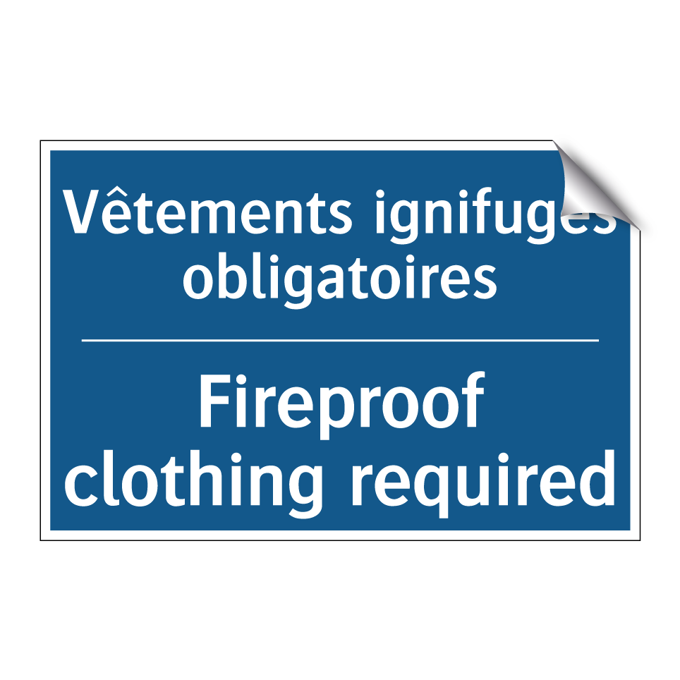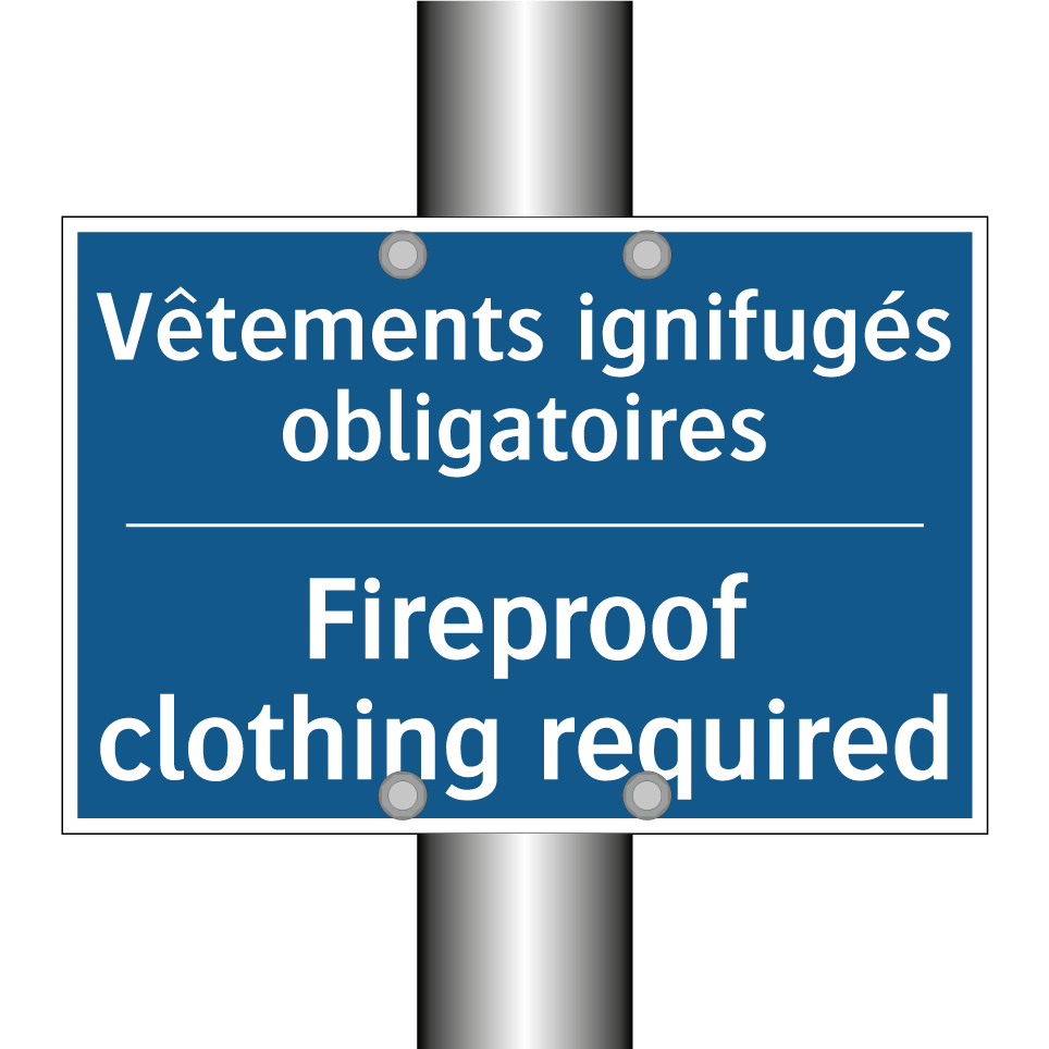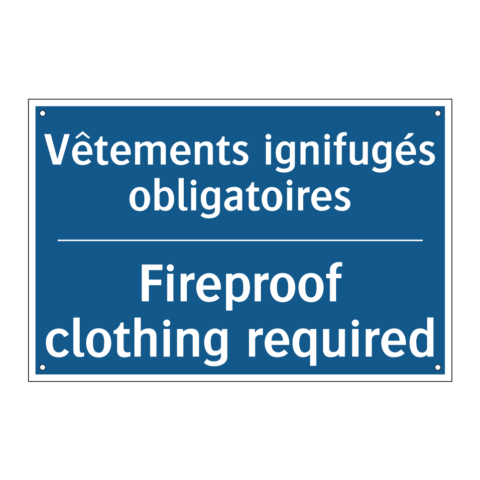 Panneau d'obligation bilingue avec texte en français : "Vêtements ignifugés obligatoires", et en anglais : "Fireproof clothing required"
