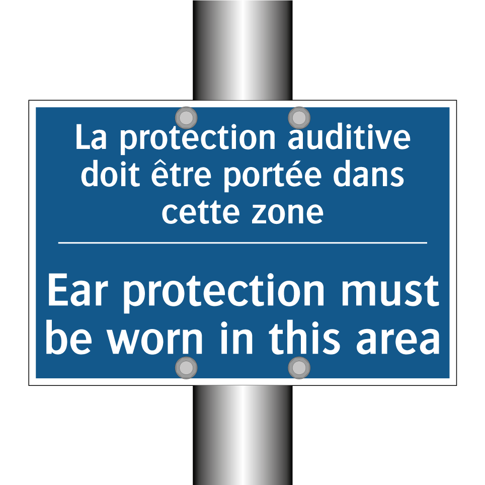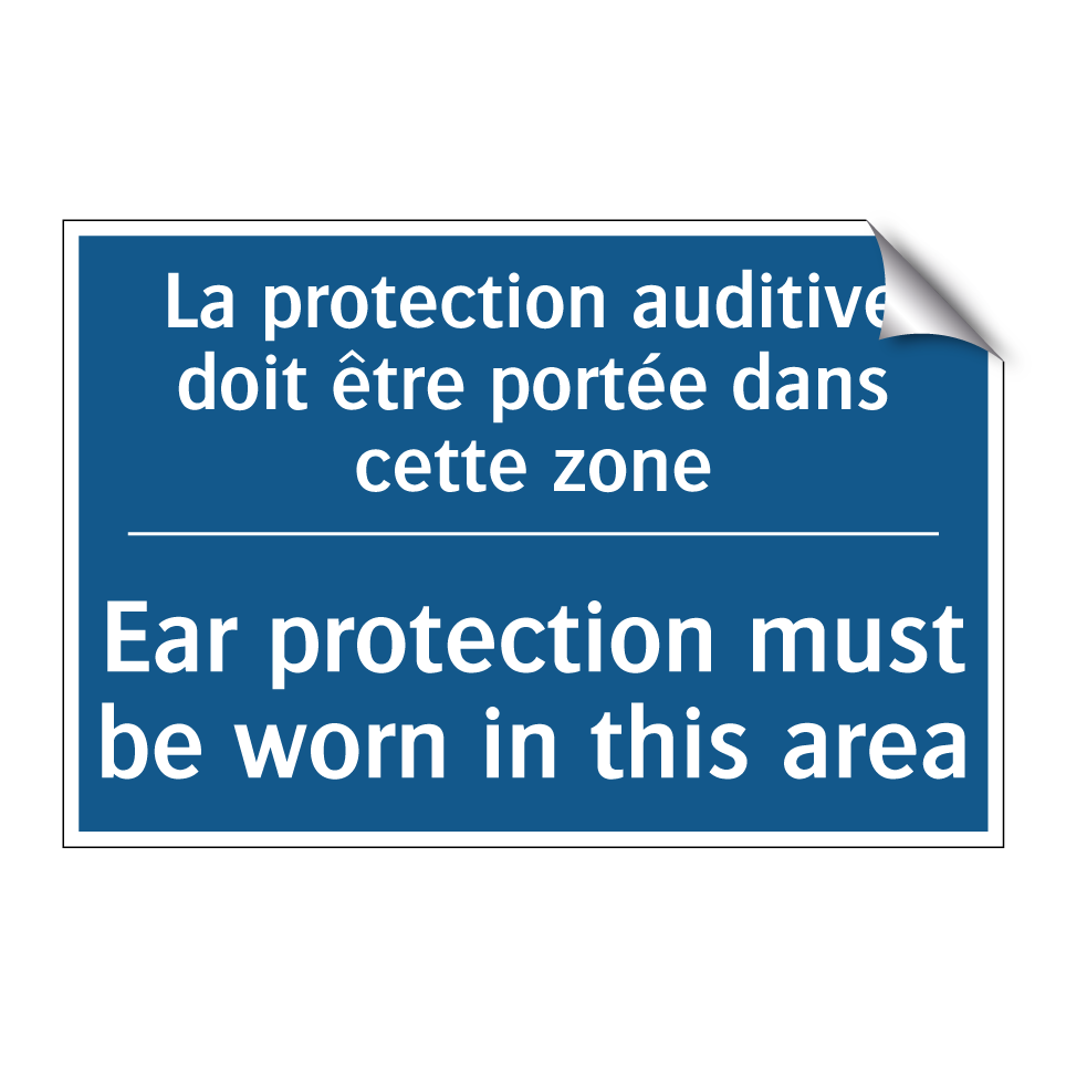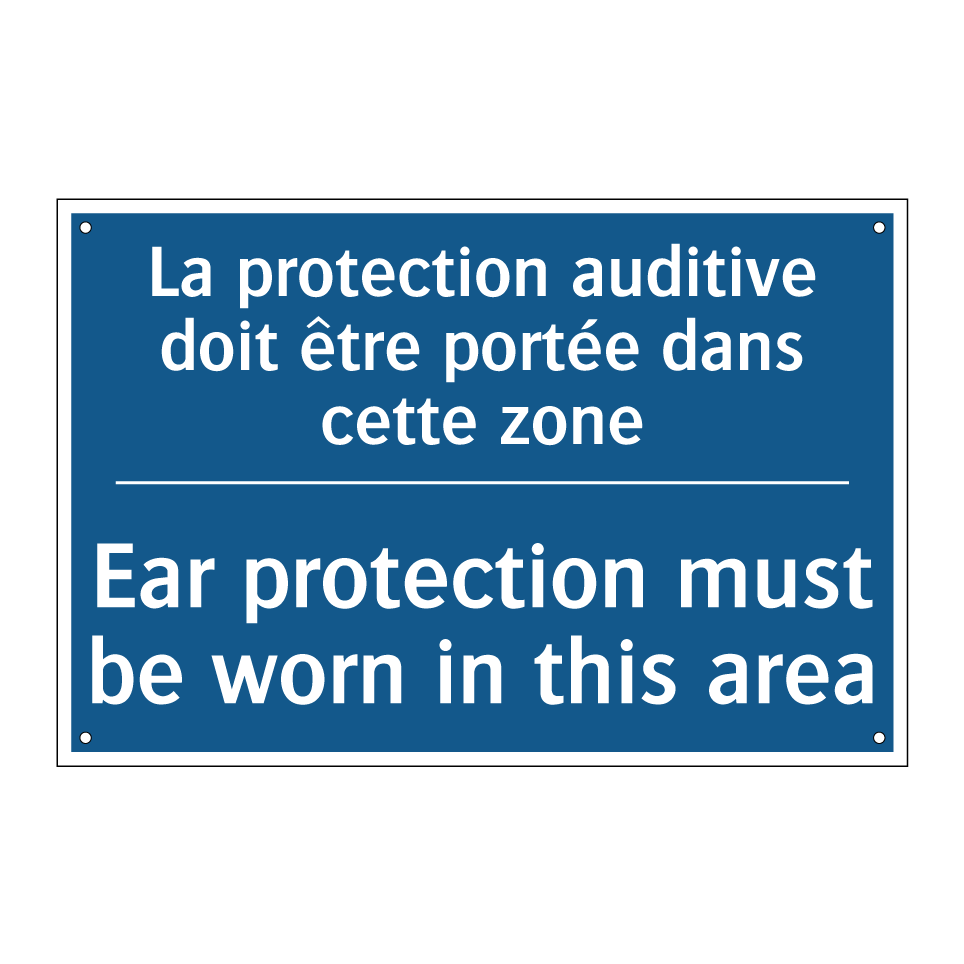 Panneau d'obligation bilingue avec texte en français : "La protection auditive doit être portée dans cette zone", et en anglais : "Ear protection must be worn in this area"