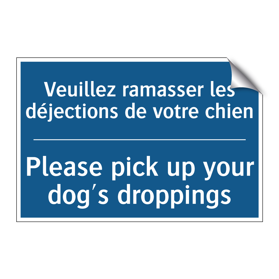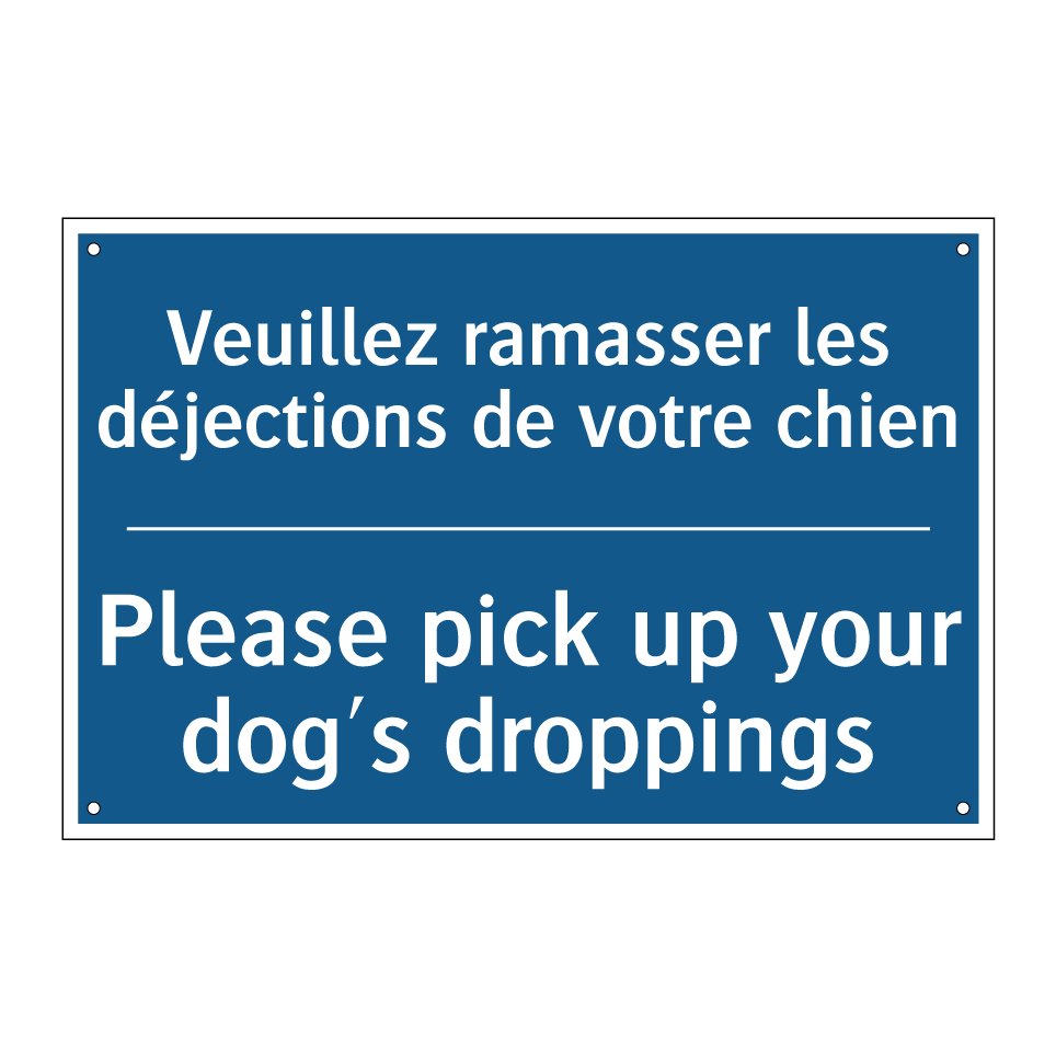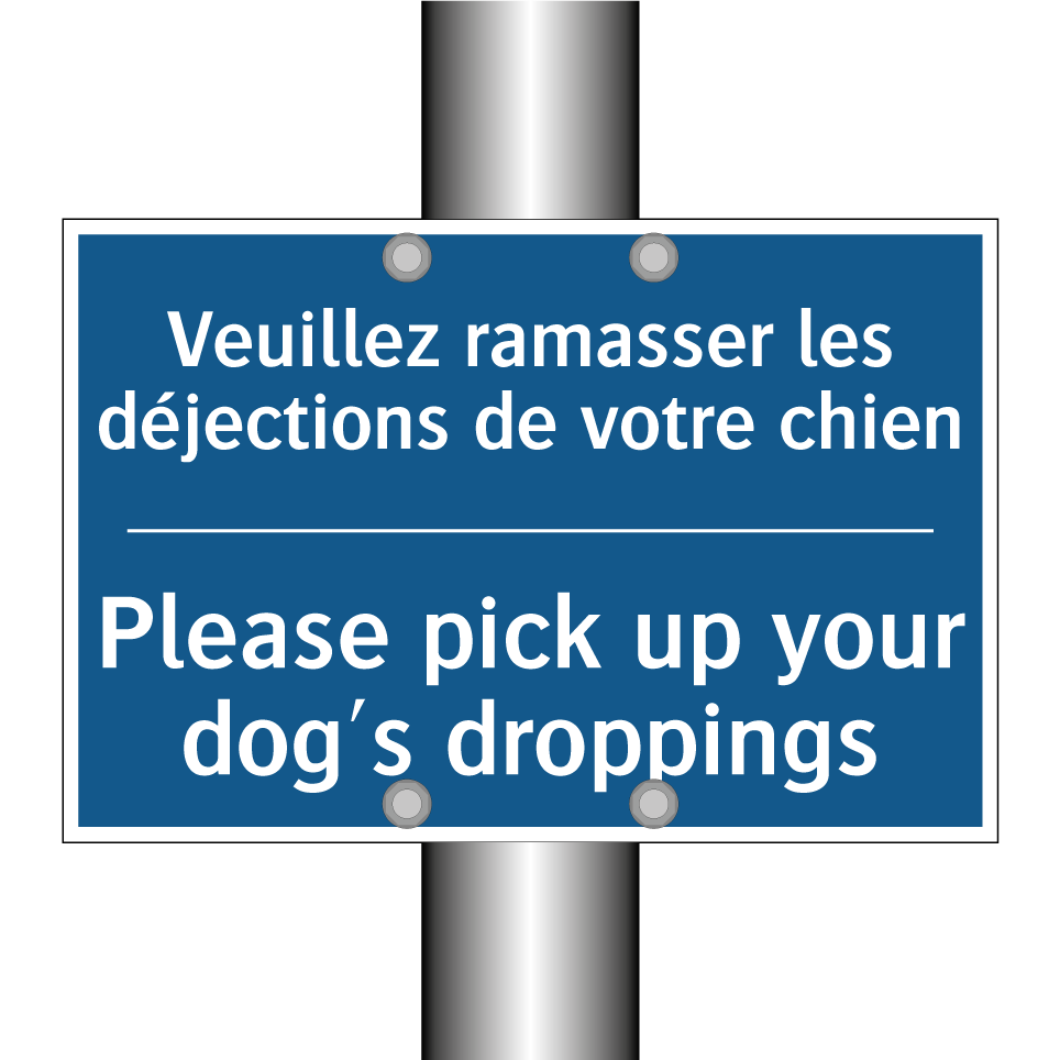 Panneau d'obligation bilingue avec texte en français : "Veuillez ramasser les déjections de votre chien", et en anglais : "Please pick up your dog's droppings"