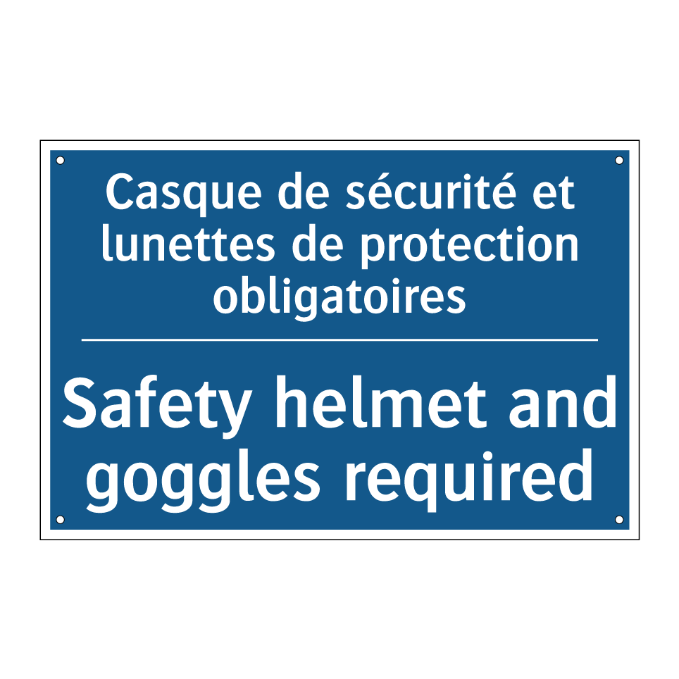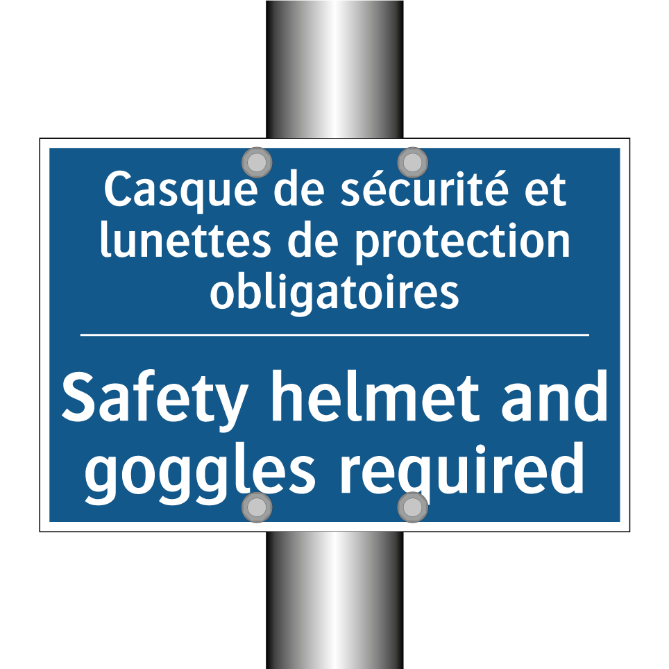 Panneau d'obligation bilingue avec texte en français : "Casque de sécurité et lunettes de protection obligatoires", et en anglais : "Safety helmet and goggles required"