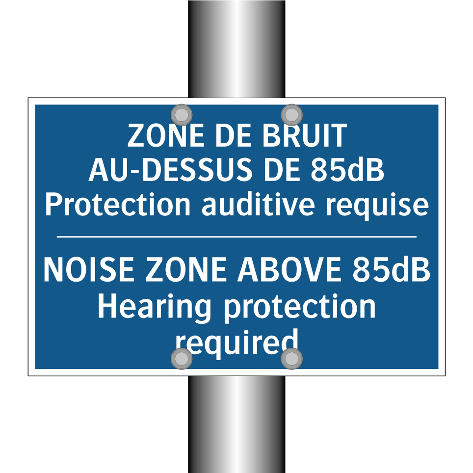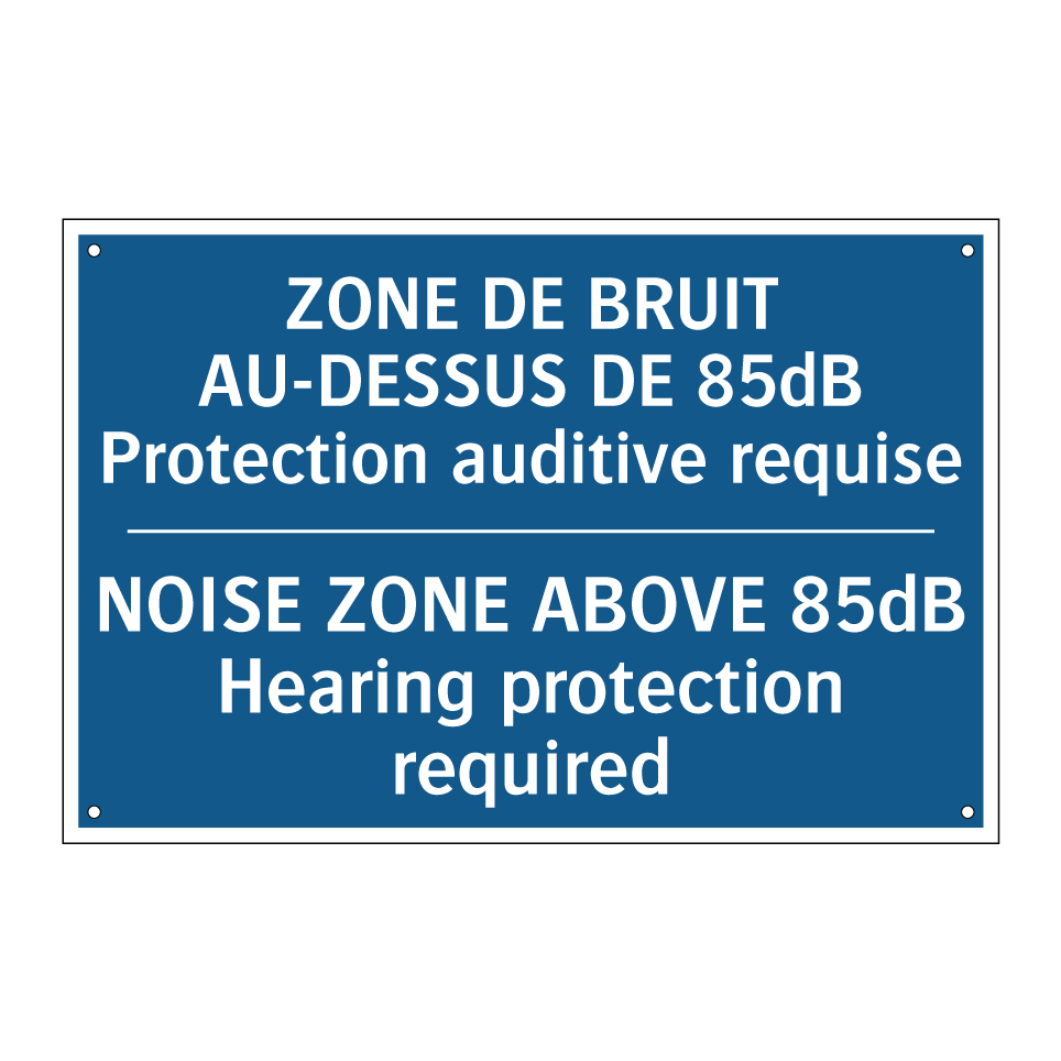 Panneau d'obligation bilingue avec texte en français : "ZONE DE BRUIT AU-DESSUS DE 85dB Protection auditive requise", et en anglais : "NOISE ZONE ABOVE 85dB Hearing protection required"