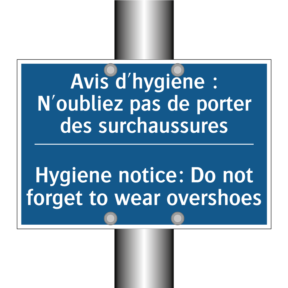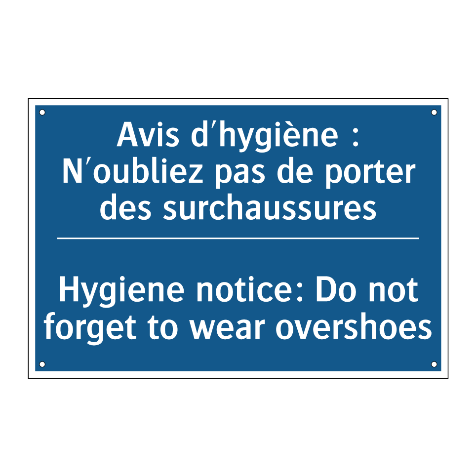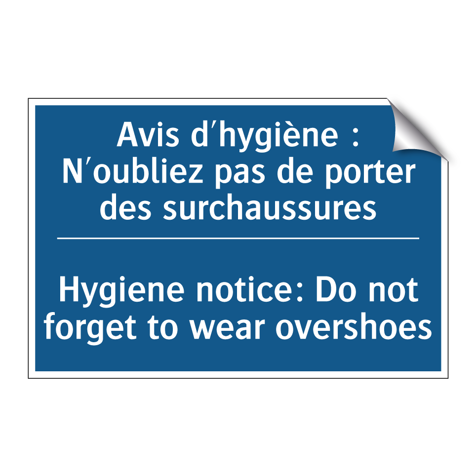 Panneau d'obligation bilingue avec texte en français : "Avis d'hygiène : N'oubliez pas de porter des surchaussures", et en anglais : "Hygiene notice: Do not forget to wear overshoes"