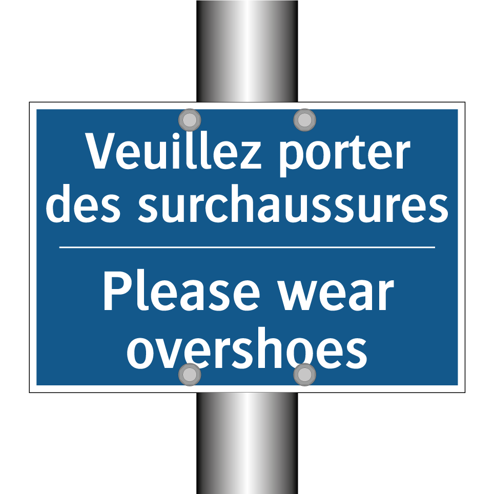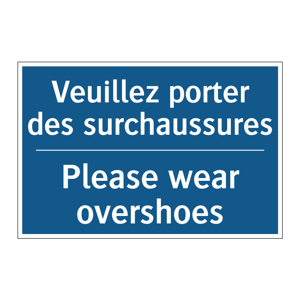 Panneau d'obligation bilingue avec texte en français : "Veuillez porter des surchaussures", et en anglais : "Please wear overshoes"
