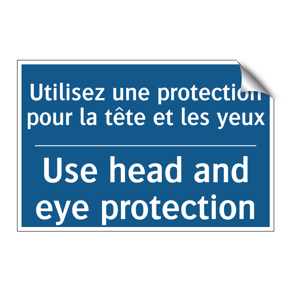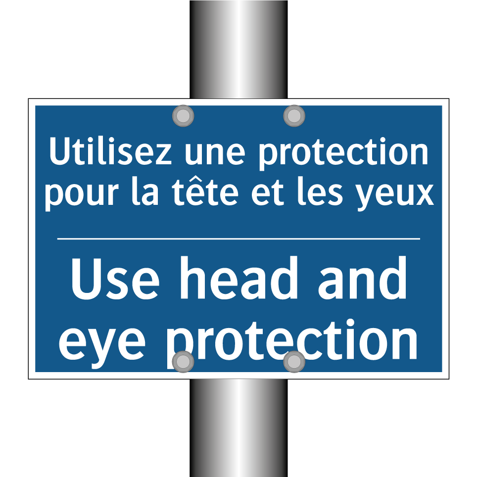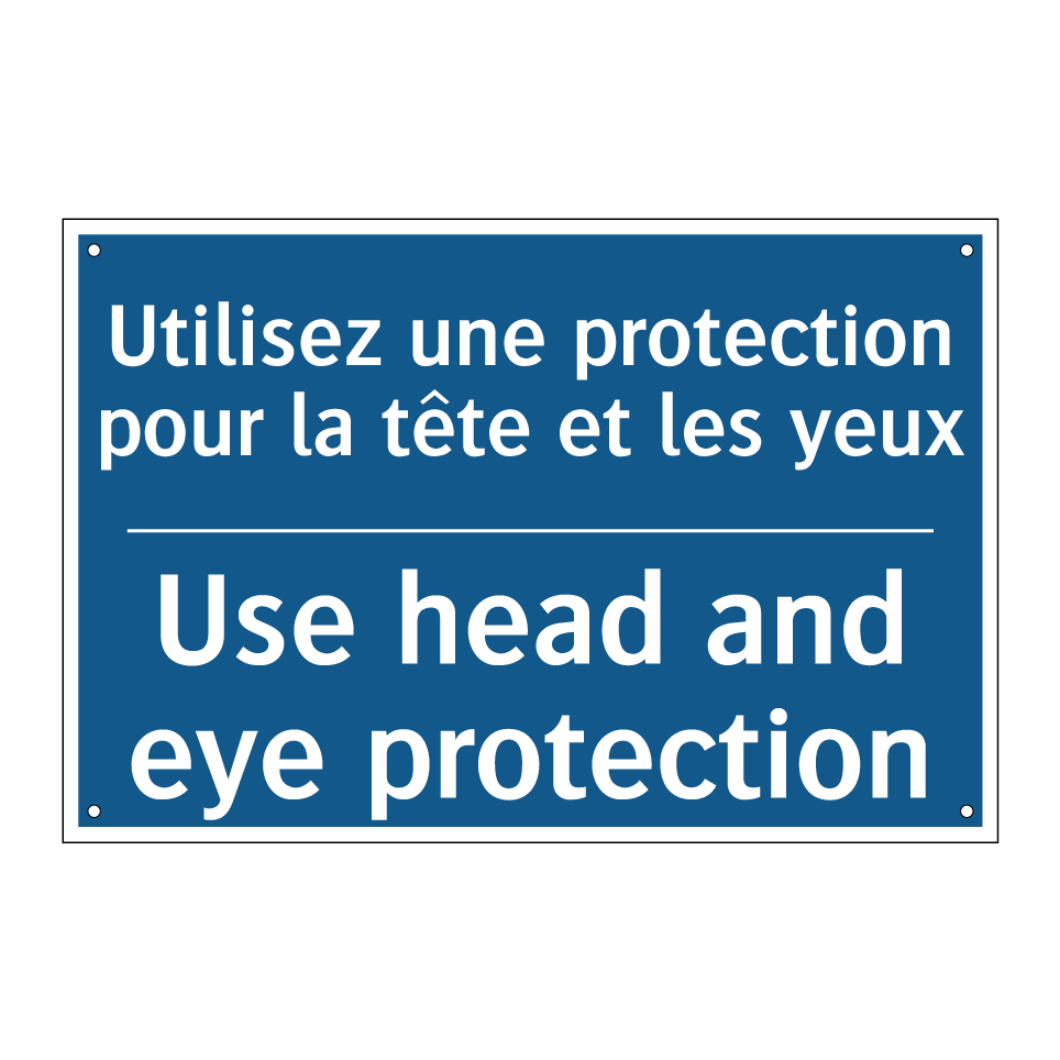 Panneau d'obligation bilingue avec texte en français : "Utilisez une protection pour la tête et les yeux", et en anglais : "Use head and eye protection"