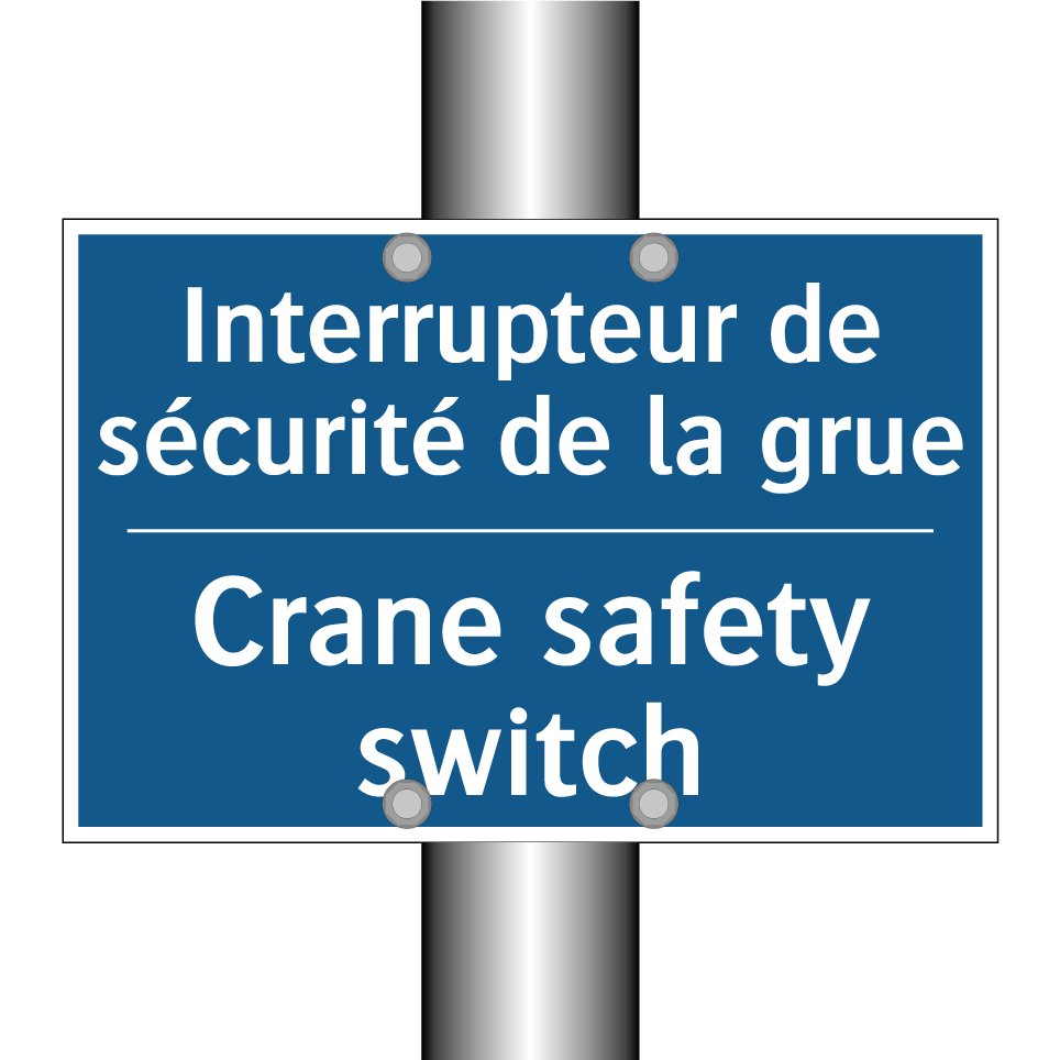 Panneau d'obligation bilingue avec texte en français : "Interrupteur de sécurité de la grue", et en anglais : "Crane safety switch"