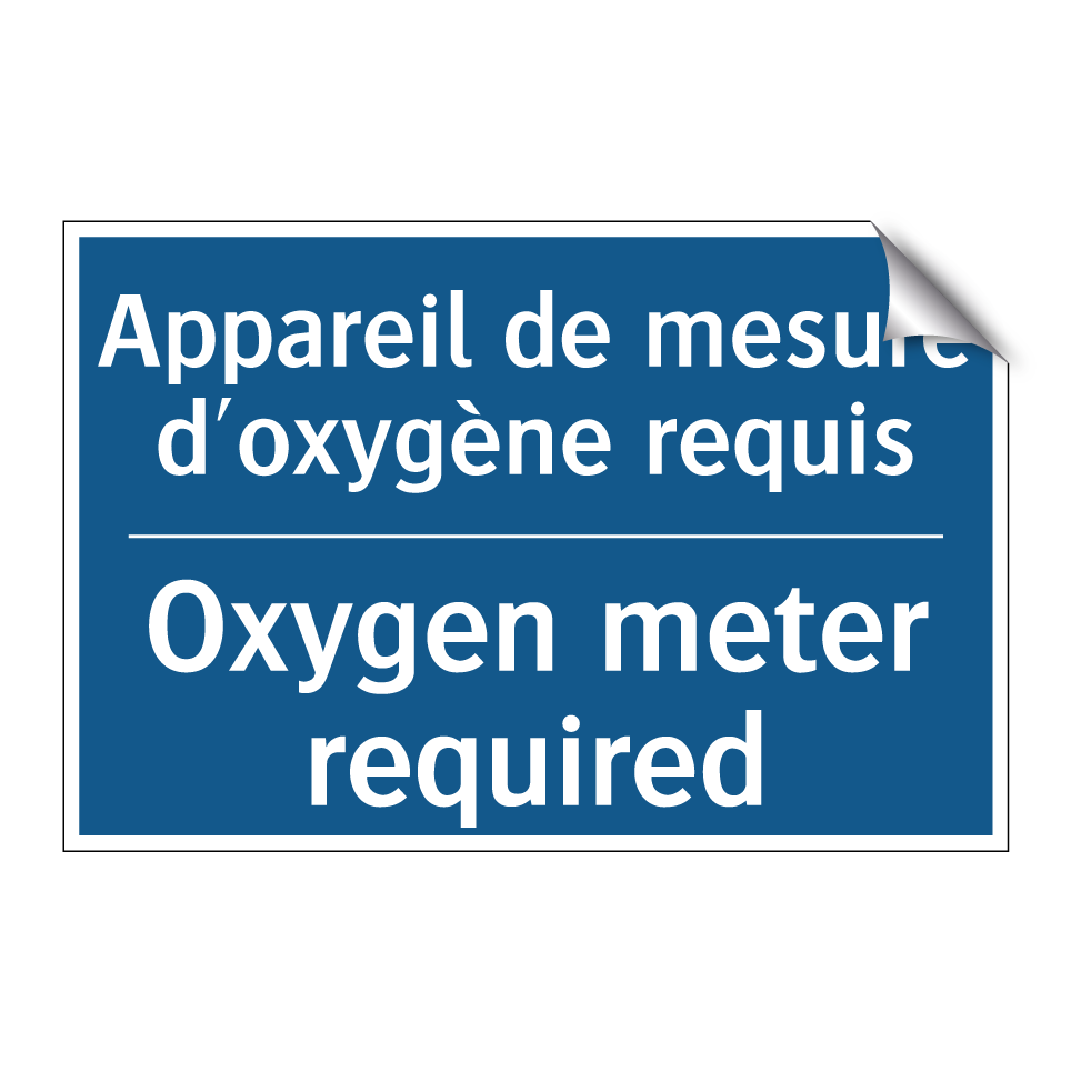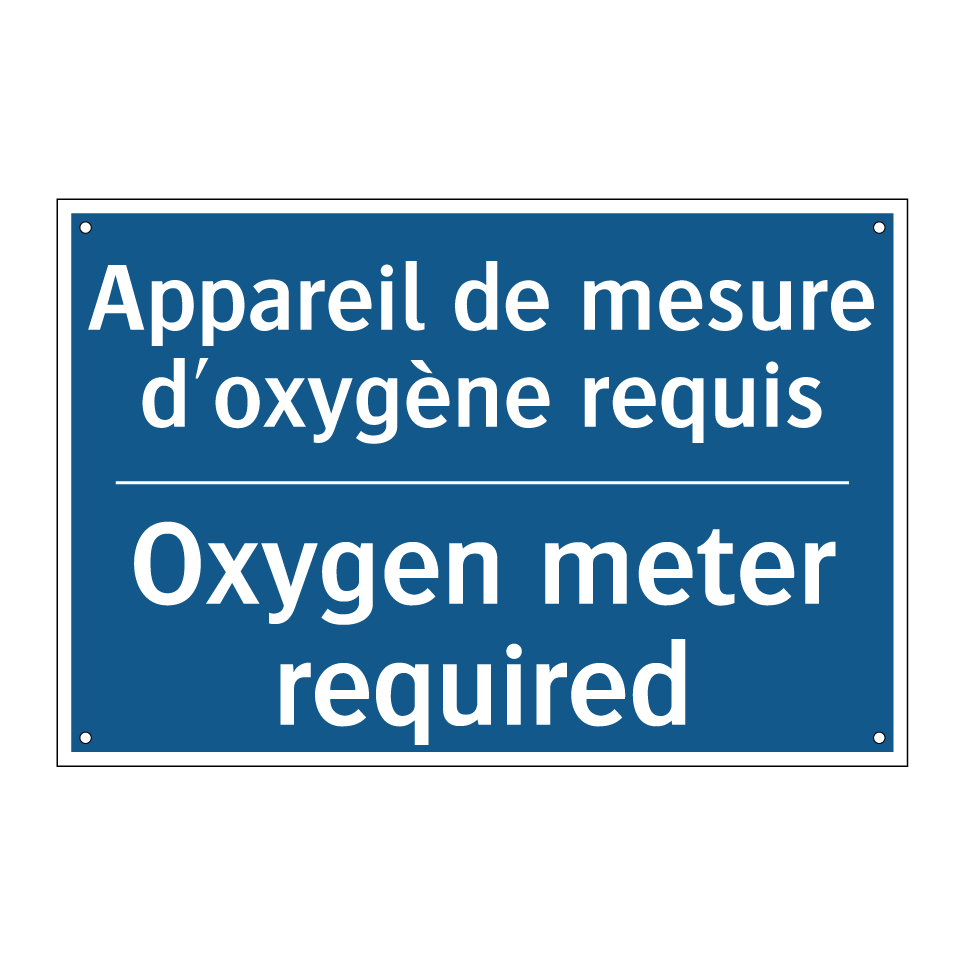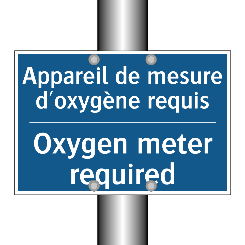 Panneau d'obligation bilingue avec texte en français : "Appareil de mesure d'oxygène requis", et en anglais : "Oxygen meter required"