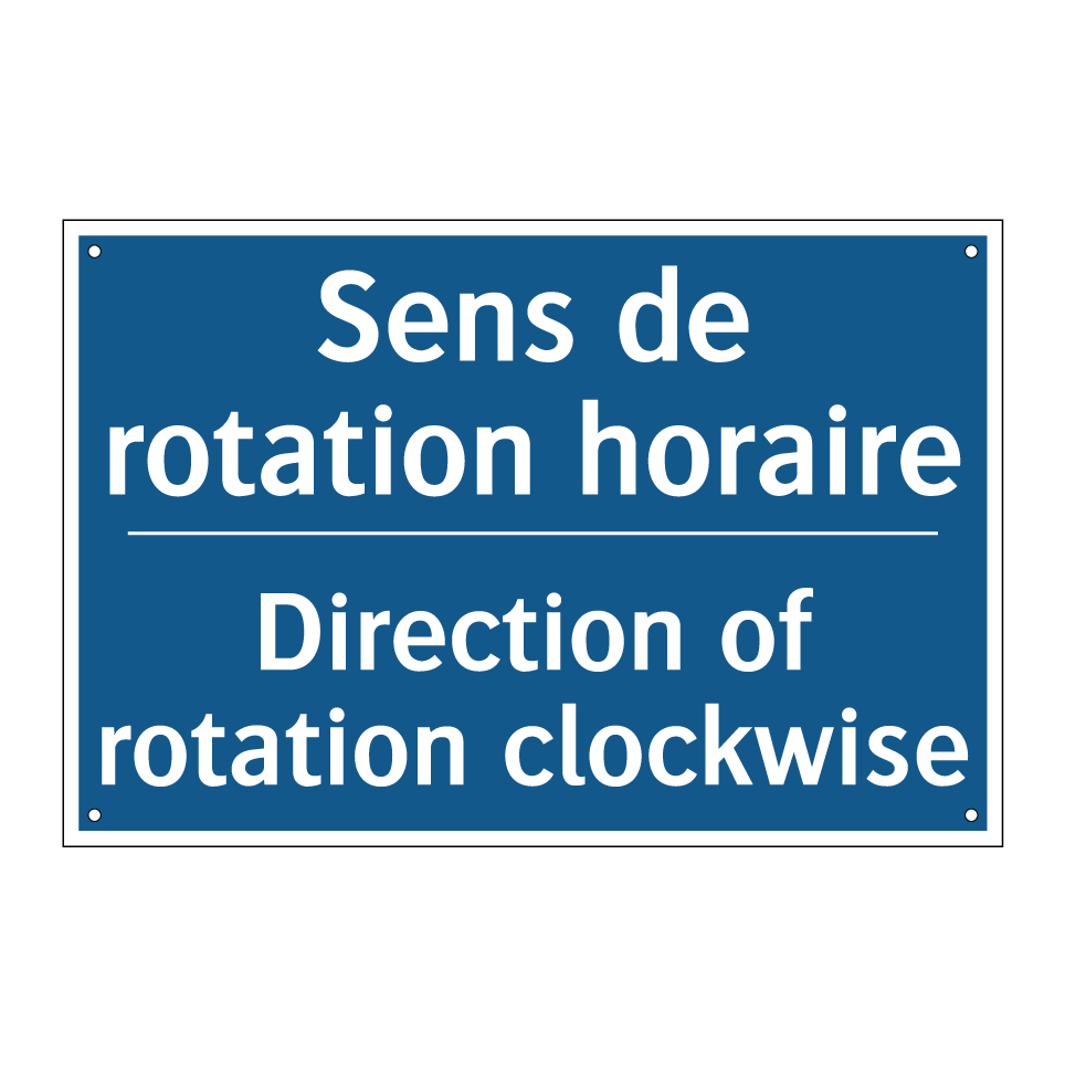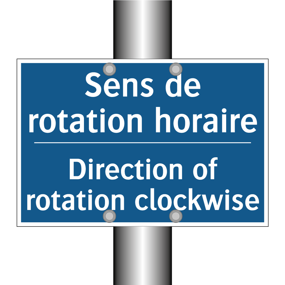 Panneau d'obligation bilingue avec texte en français : "Sens de rotation horaire", et en anglais : "Direction of rotation clockwise"