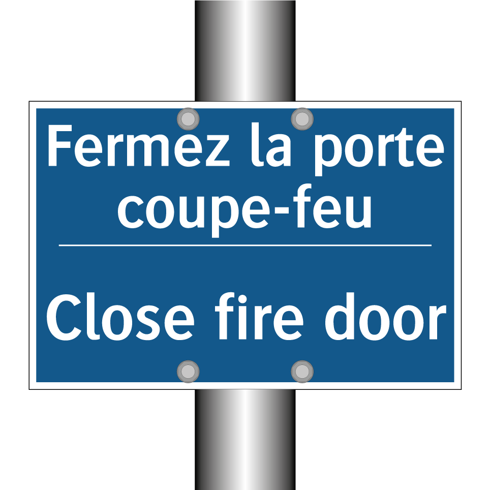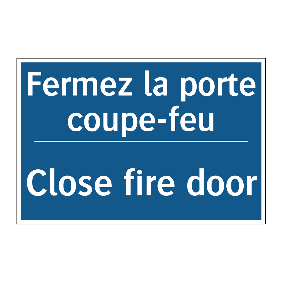 Panneau d'obligation bilingue avec texte en français : "Fermez la porte coupe-feu", et en anglais : "Close fire door"
