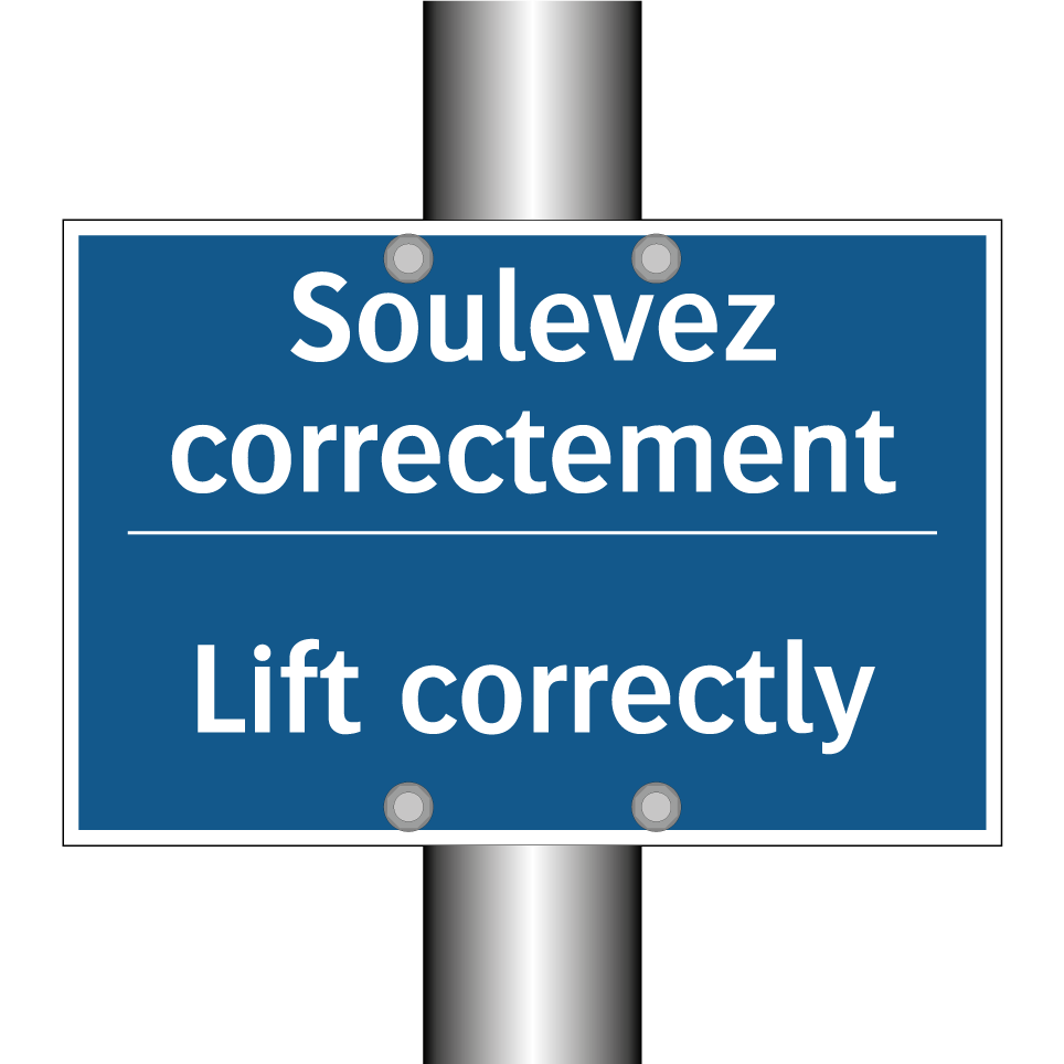 Panneau d'obligation bilingue avec texte en français : "Soulevez correctement", et en anglais : "Lift correctly"